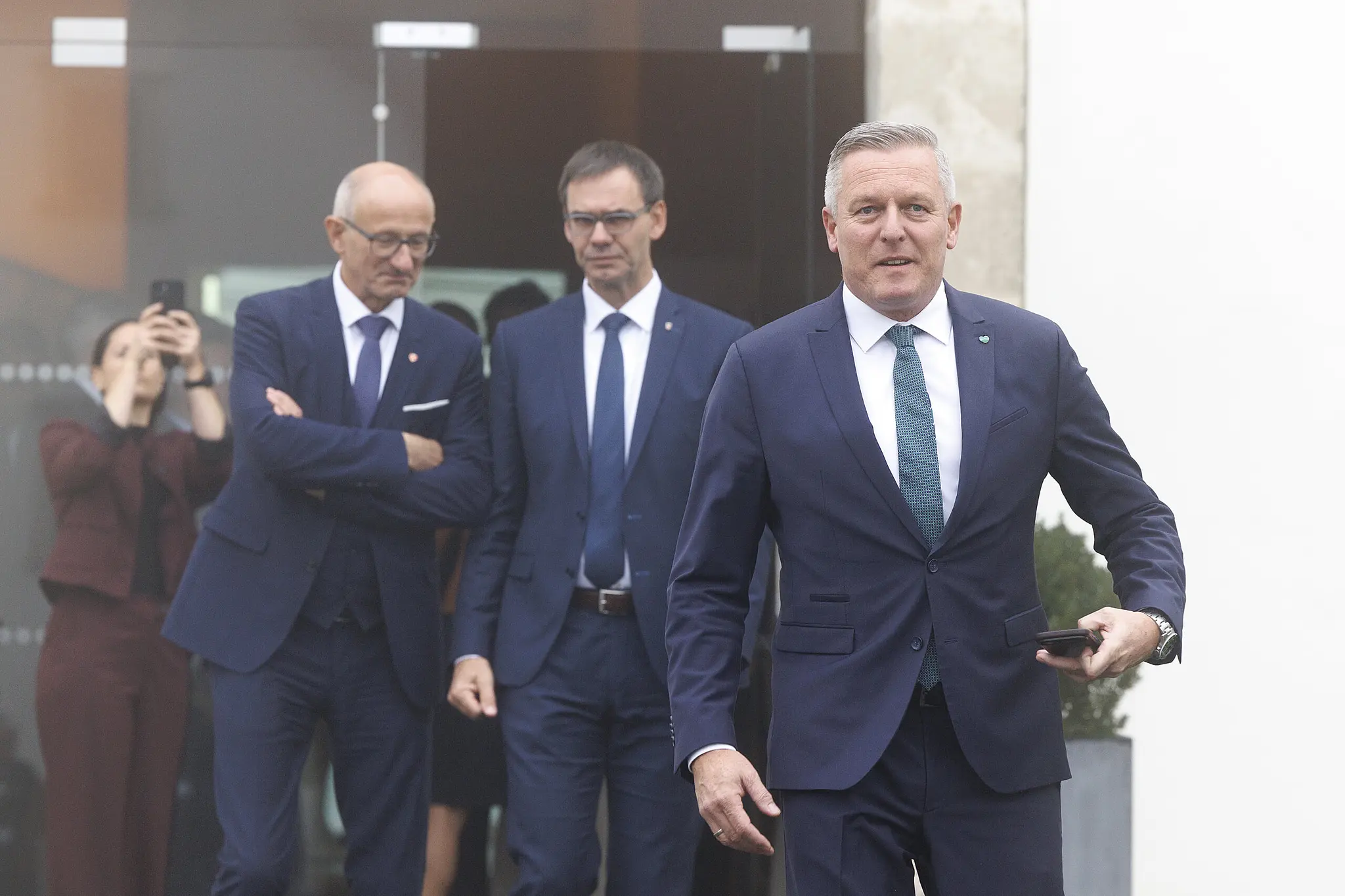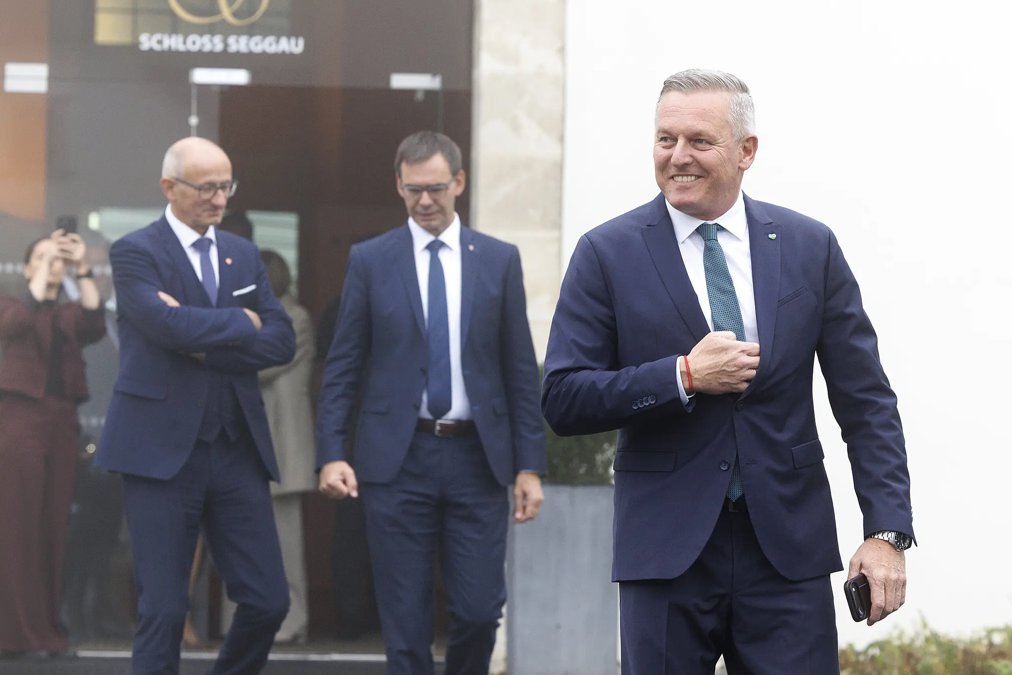 Im Bild von links: Landeshauptmann von Tirol, Anton Mattle (ÖVP), Landeshauptmann von Vorarlberg, Markus Wallner (ÖVP), und Landeshauptmann Mario Kunasek (FPÖ) am Freitag, 14. November 2025, anl. der Landeshauptleutekonferenz im Schloss Seggau in Seggauberg.