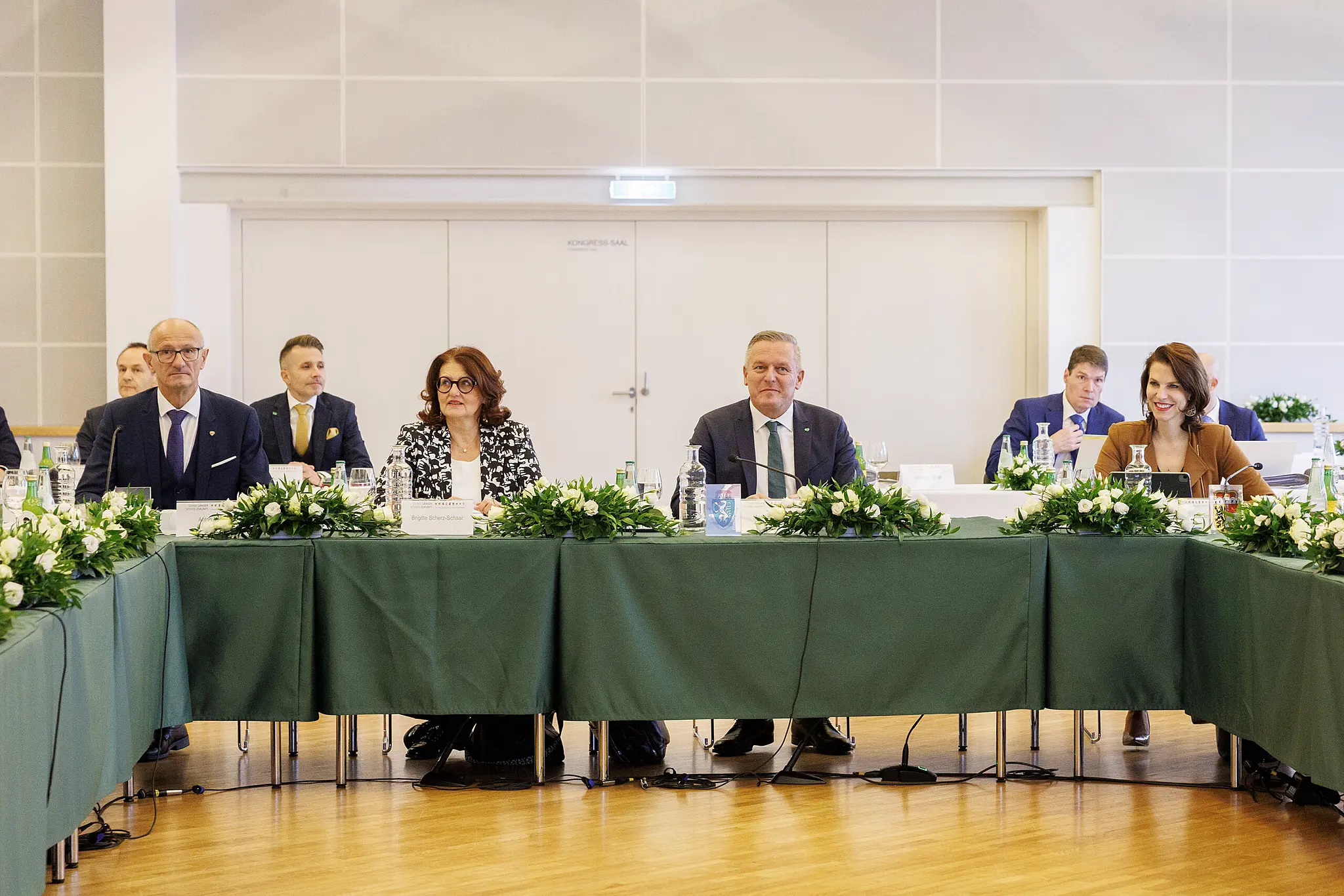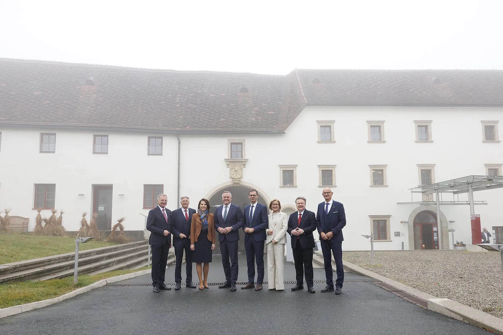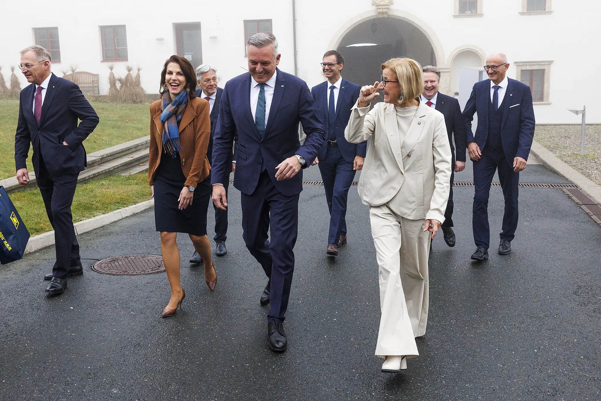 Im Bild von links: Landeshauptmann von Tirol, Anton Mattle (ÖVP), Landesamtsdirektorin Brigitte Scherz-Schaar, Landeshauptmann Mario Kunasek (FPÖ) und die Landeshauptfrau von Salzburg, Karoline Edstadler (ÖVP) am Freitag, 14. November 2025, anl. der Landeshauptleutekonferenz im Schloss Seggau in Seggauberg.