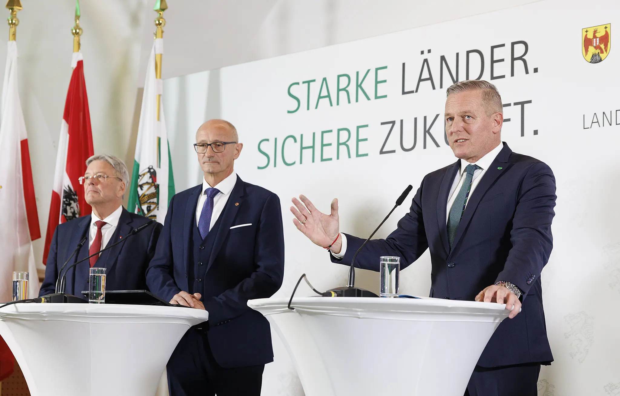 Im Bild von links: Landeshauptmann von Kärnten, Peter Kaiser (SPÖ), Landeshauptmann von Tirol, Anton Mattle (ÖVP), und Landeshauptmann Mario Kunasek (FPÖ) am Freitag, 14. November 2025, während einer Pressekonferenz anl. der Landeshauptleutekonferenz im Schloss Seggau in Seggauberg.