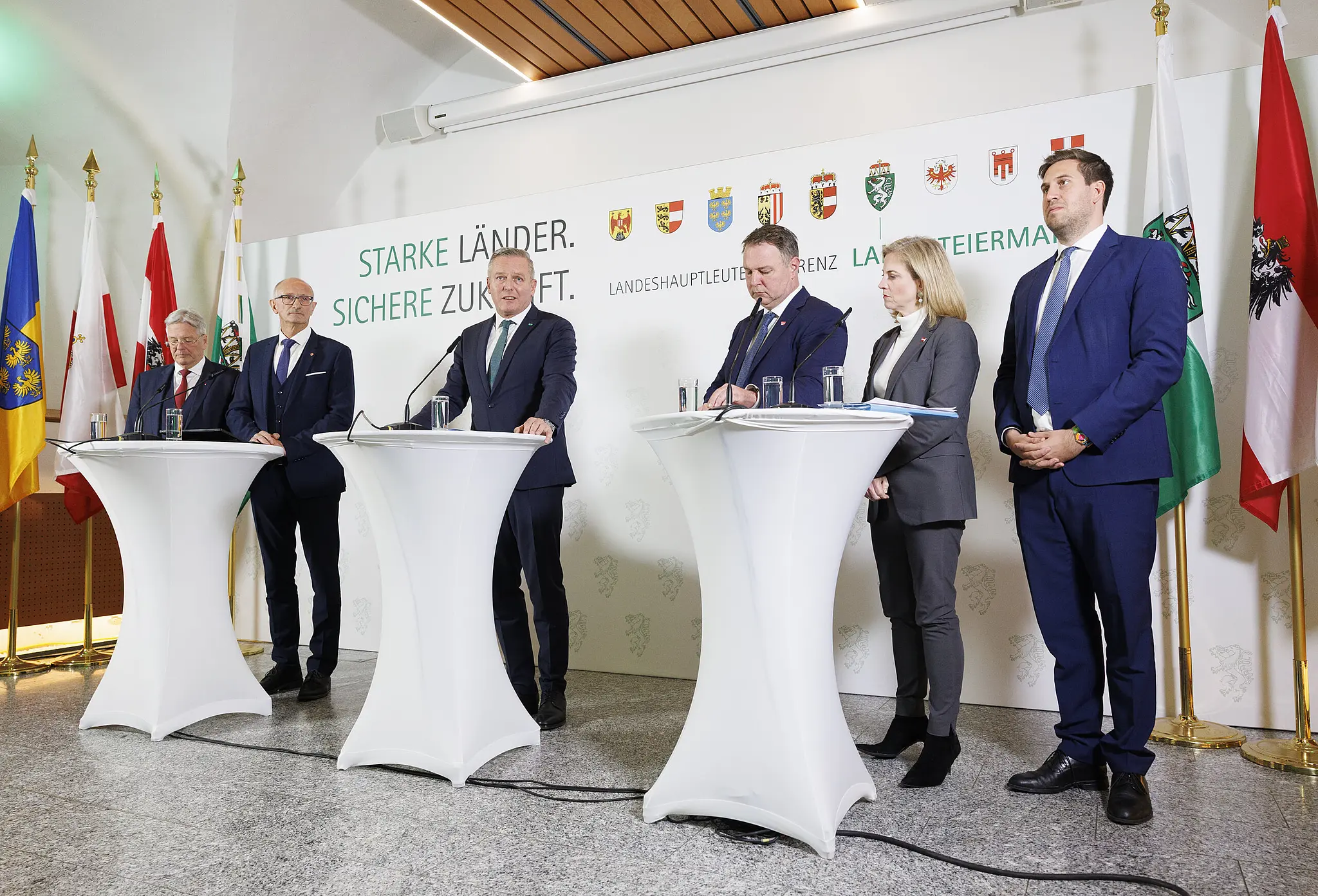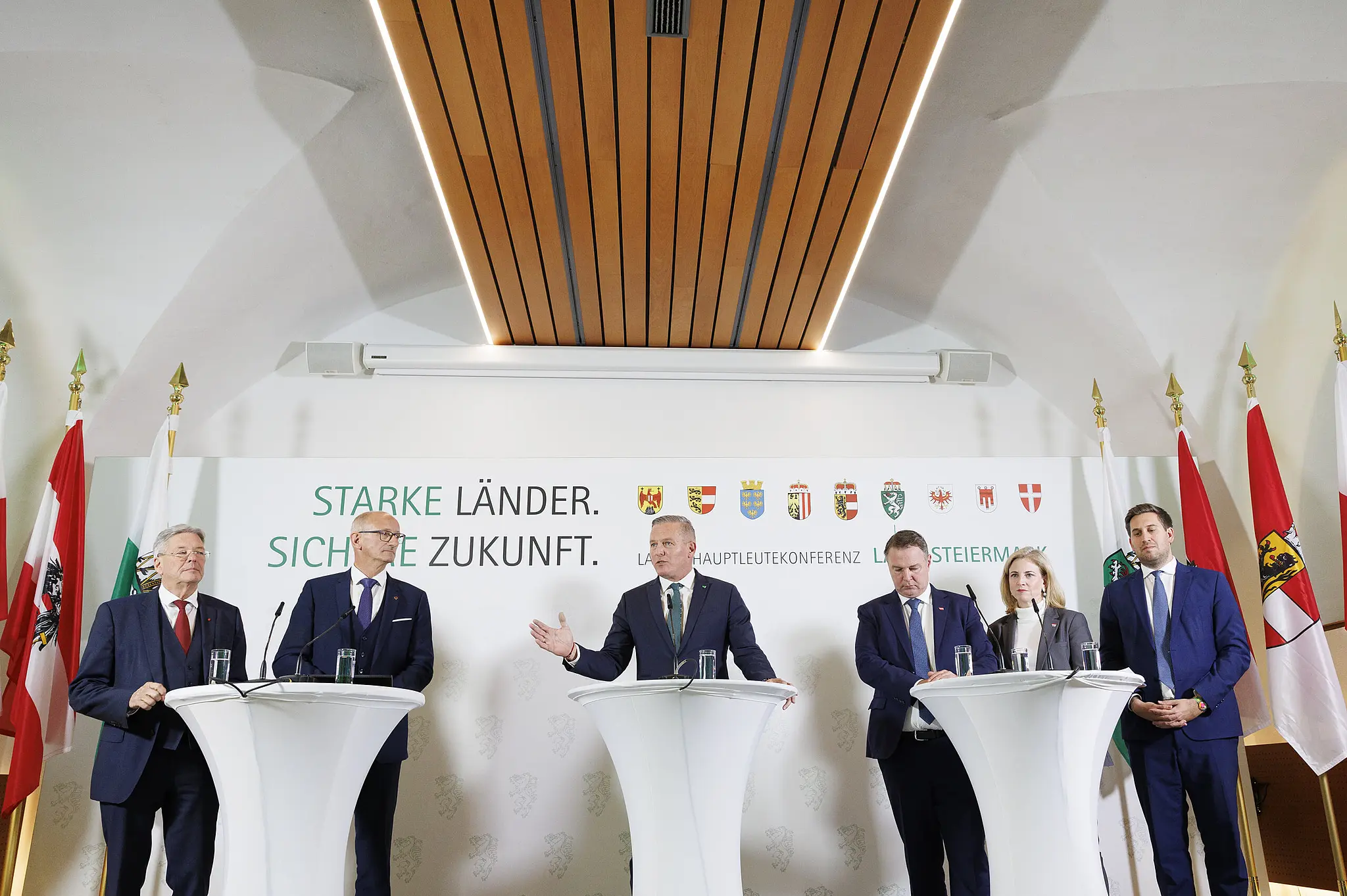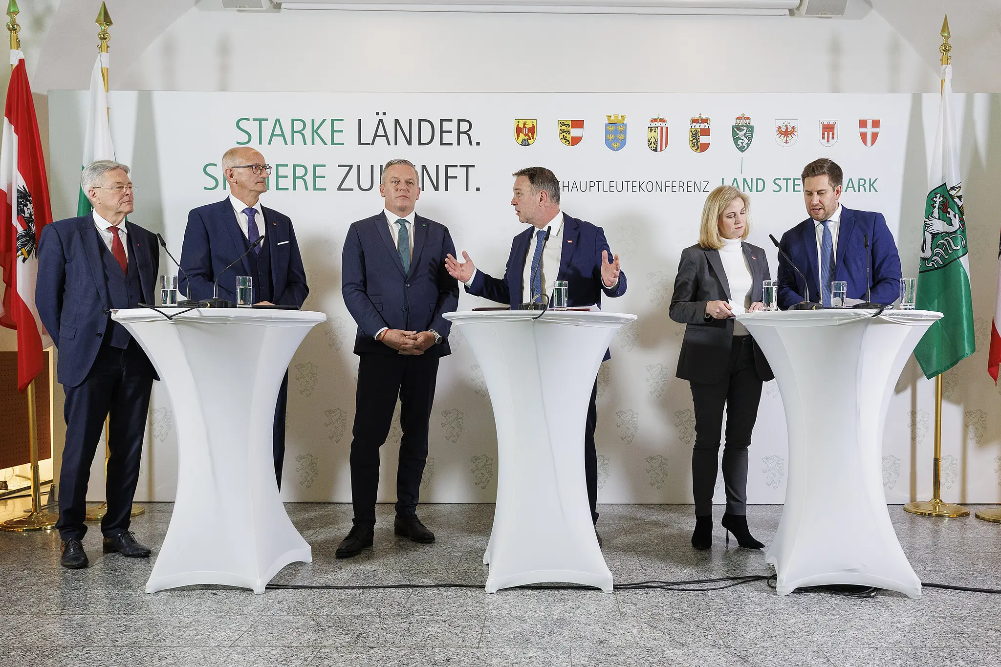 Im Bild von links: Landeshauptmann von Kärnten, Peter Kaiser (SPÖ), Landeshauptmann von Tirol, Anton Mattle (ÖVP), Landeshauptmann Mario Kunasek (FPÖ), Vizekanzler Andreas Babler (SPÖ), BM Beate Meinl-Reisinger (NEOS) und Staatssekretär Alexander Pröll (ÖVP) am Freitag, 14. November 2025, während einer Pressekonferenz anl. der Landeshauptleutekonferenz im Schloss Seggau in Seggauberg.
