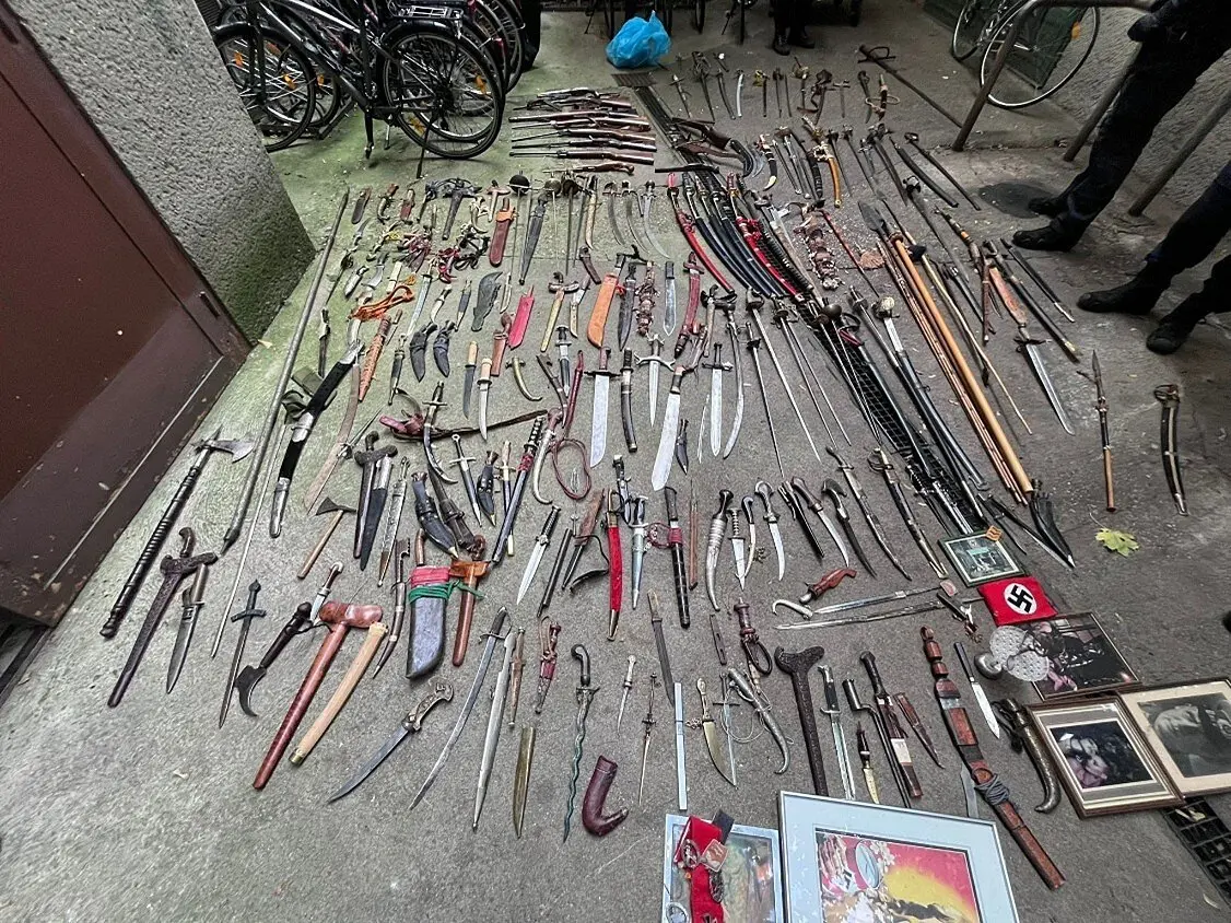Unter den zahlreichen Blankwaffen befand sich auch ein Stock mit Metallspitze, der von den Beamten als verbotene Waffe eingeordnet wurde. Ebenfalls im Besitz des Mannes befanden sich Gegenstände mit nationalsozialistischem Hintergrund. Entsprechende Anzeigen wurden erstattet.