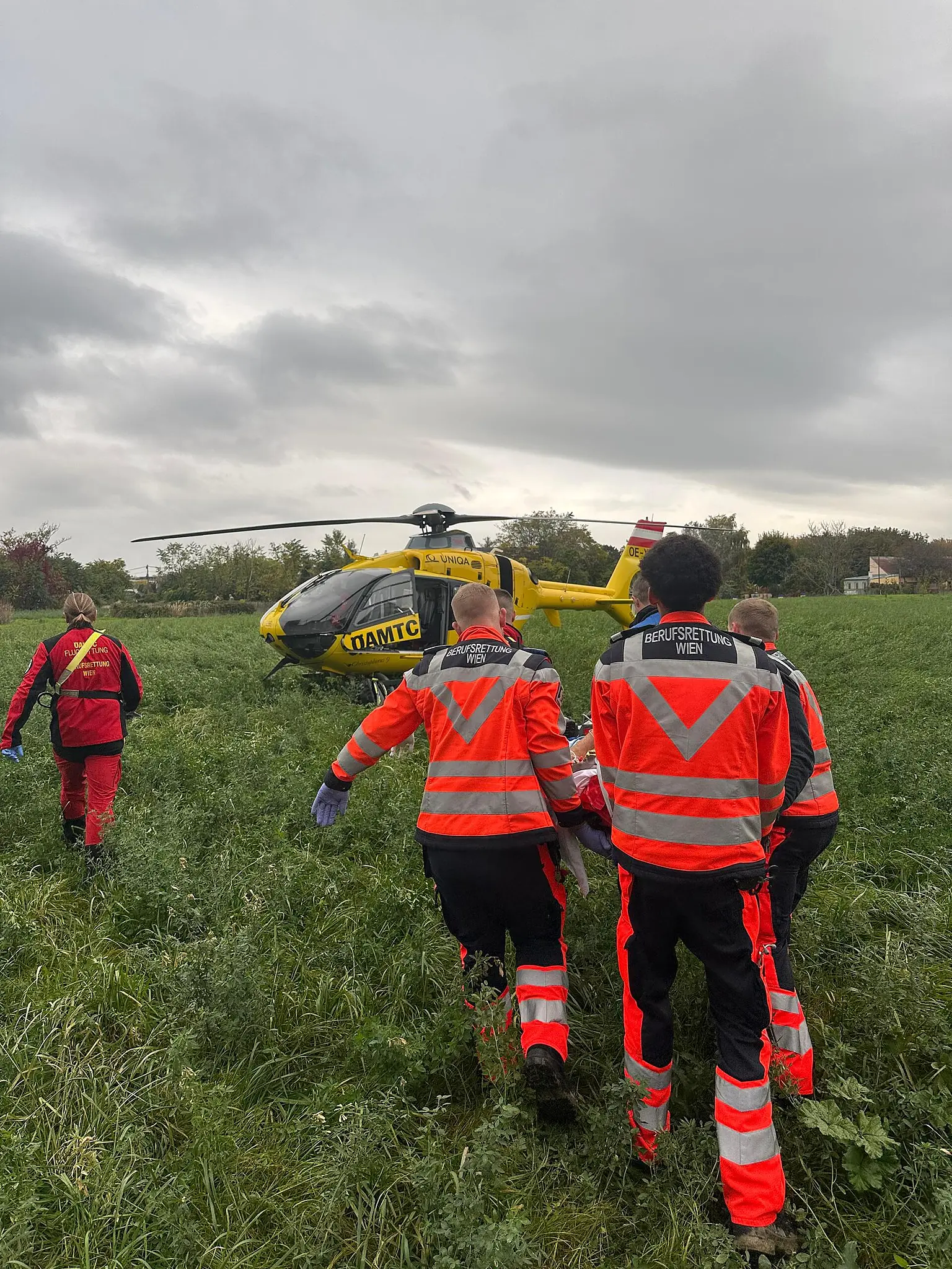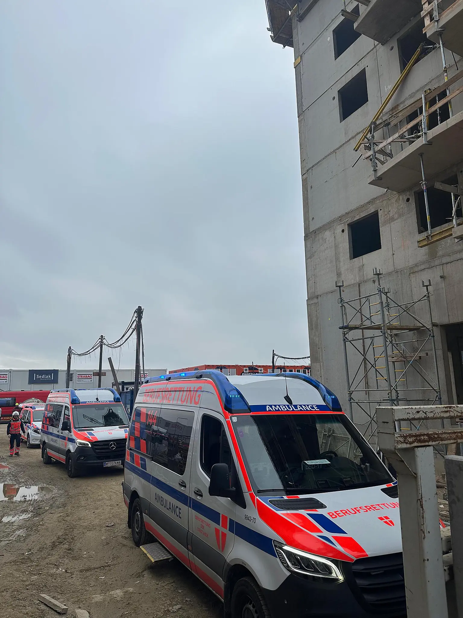 Zwei Männer sind bei Arbeiten auf einer Baustelle in Wien-Floridsdorf Mittwochfrüh, 15. Oktober 2025, schwer verletzt worden. Die Arbeiter stürzten laut Informationen der Wiener Berufsrettung zwischen acht und zehn Meter in die Tiefe.