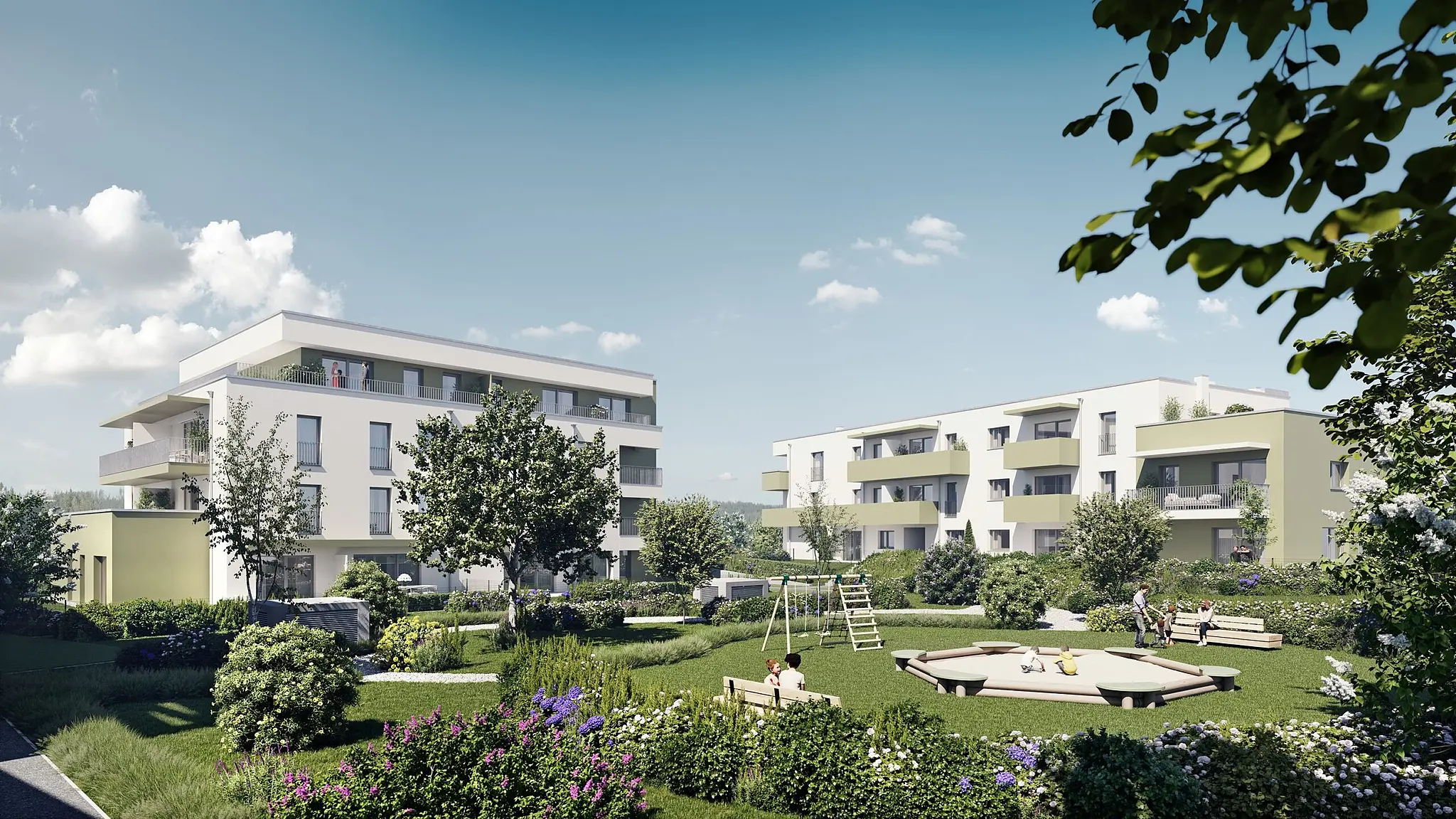 In der Nähe zu den Wohnungen befinden sich der Bahnhof, Bushaltestellen und das Schulzentrum. Ein Innenhof mit Spielplatz und Grünanlage verbindet die Bauteile zu einer Begegnungszone. Insgesamt stehen 64 Tiefgaragen- und 28 Außenstellplätze zur Verfügung.
