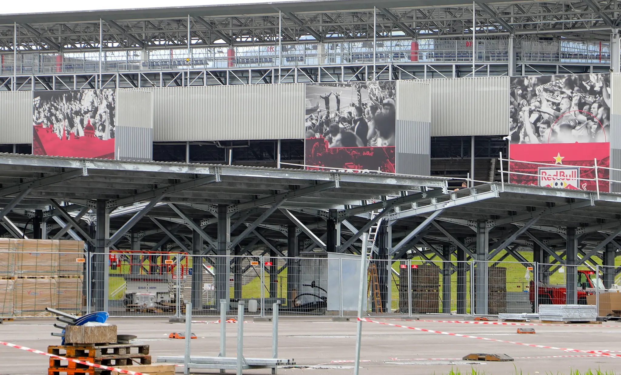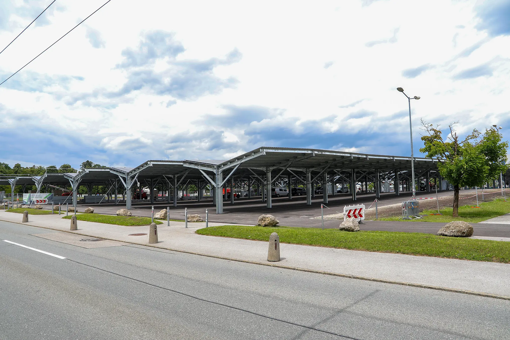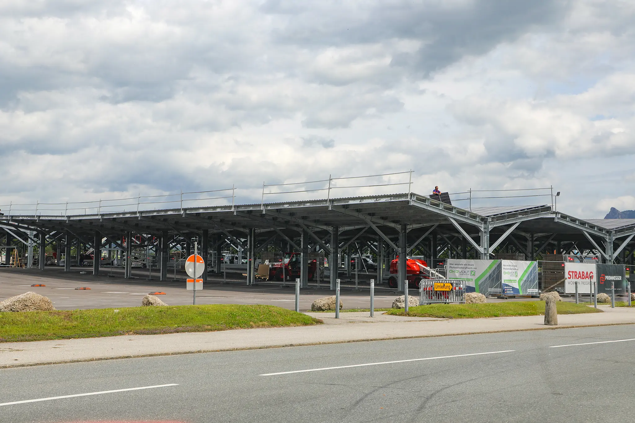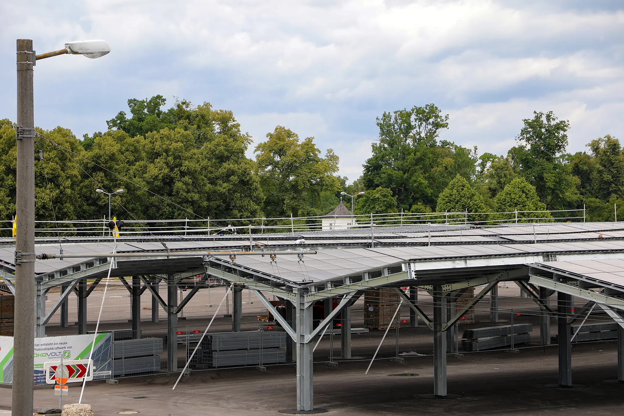 Der Bau der Photovoltaik-Carport-Anlage vor der Red-Bull-Arena steht vor dem Abschluss.