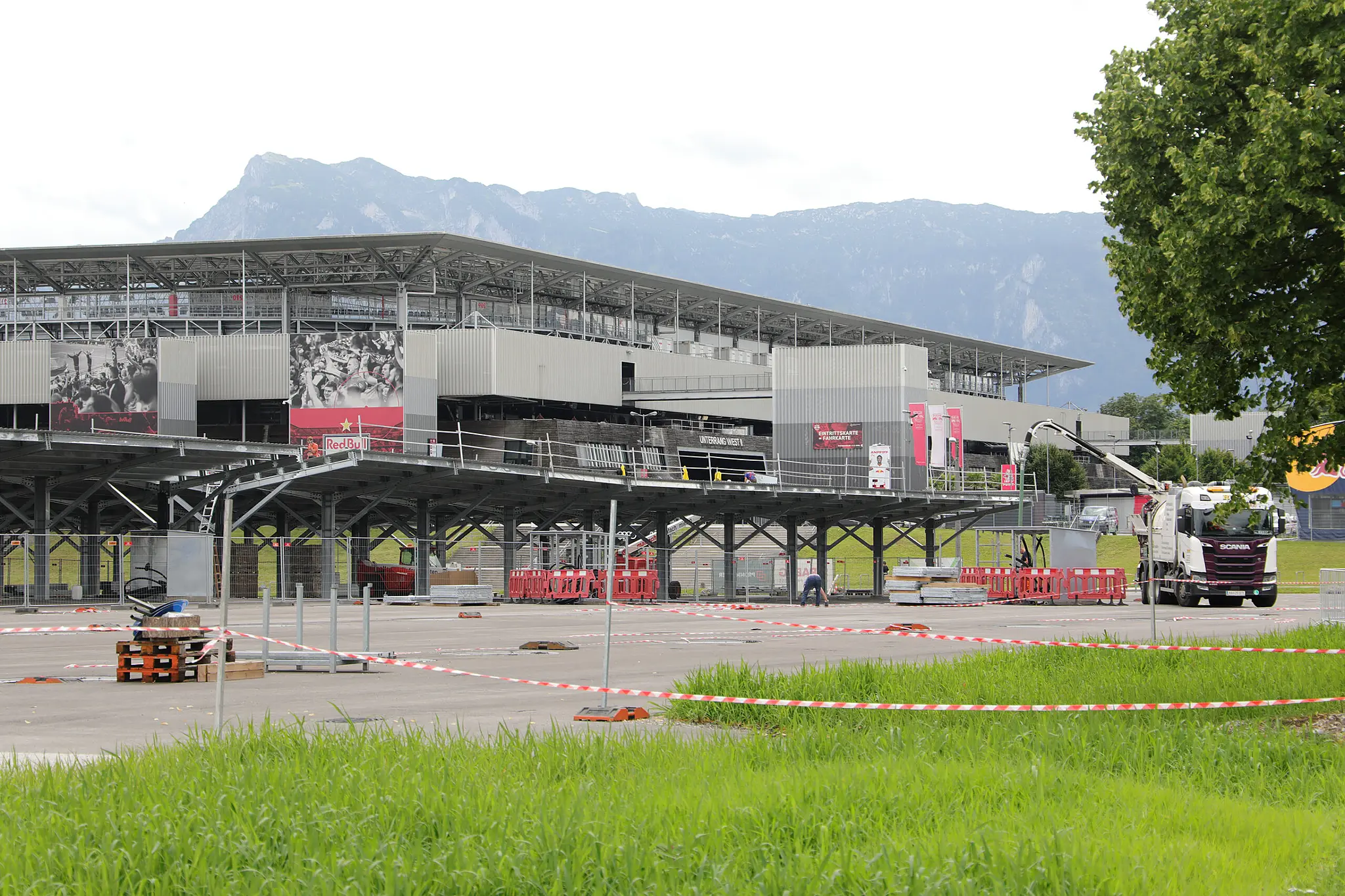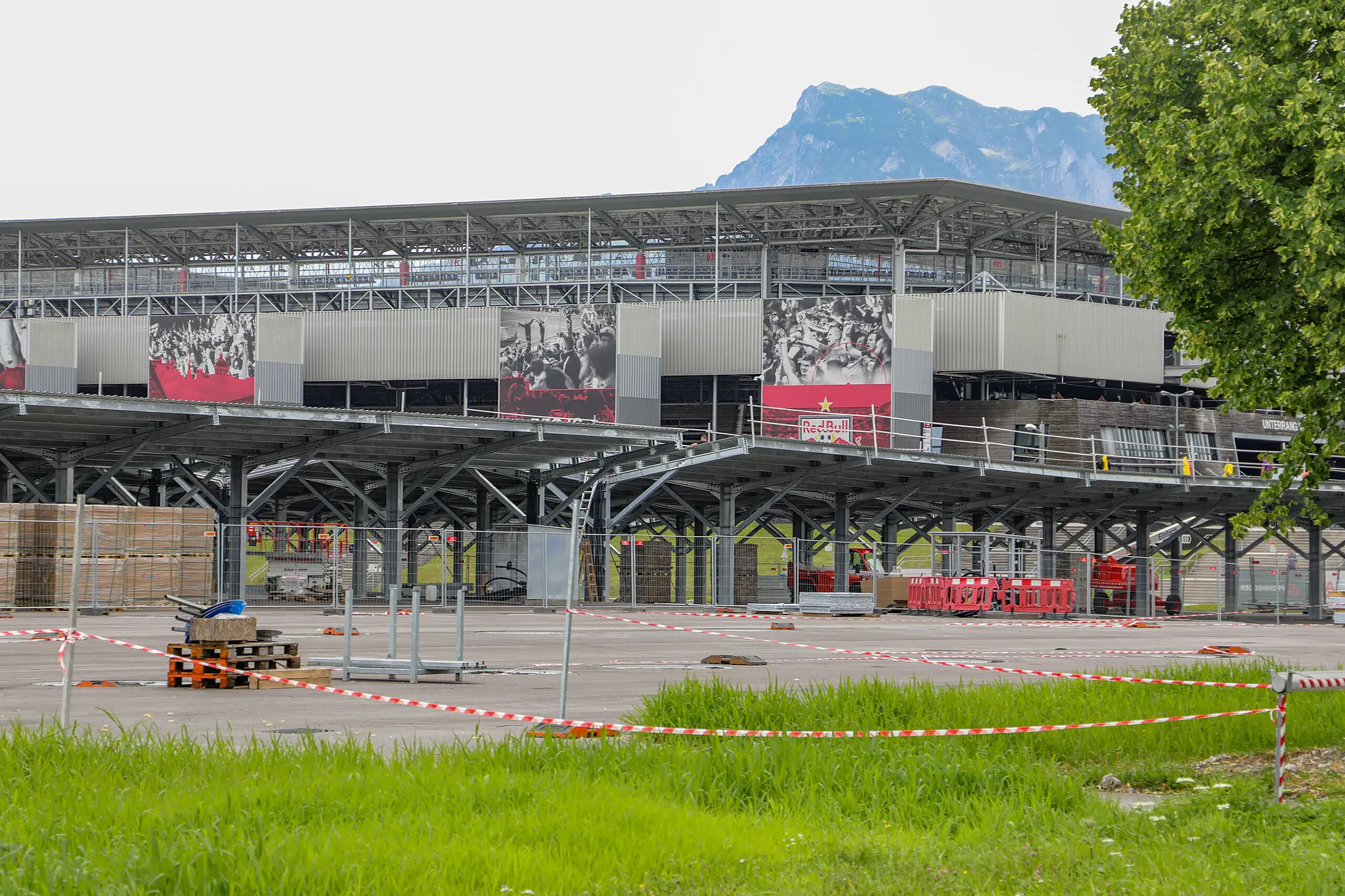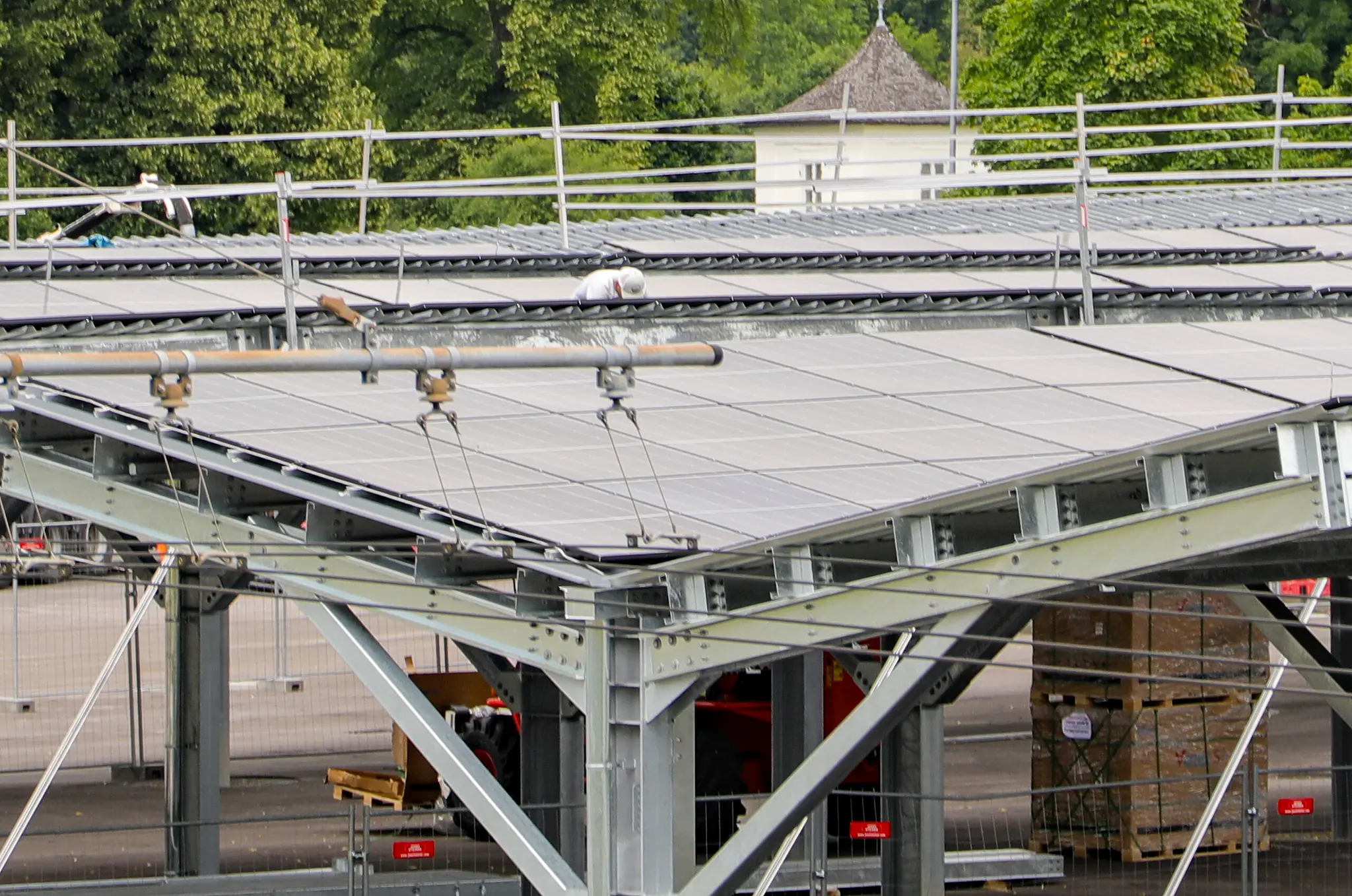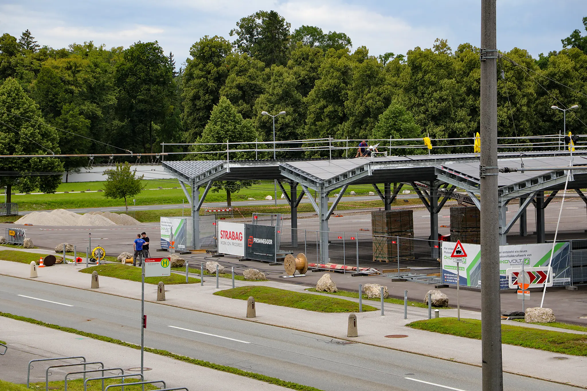Der Bau der Photovoltaik-Carport-Anlage vor der Red-Bull-Arena steht vor dem Abschluss.