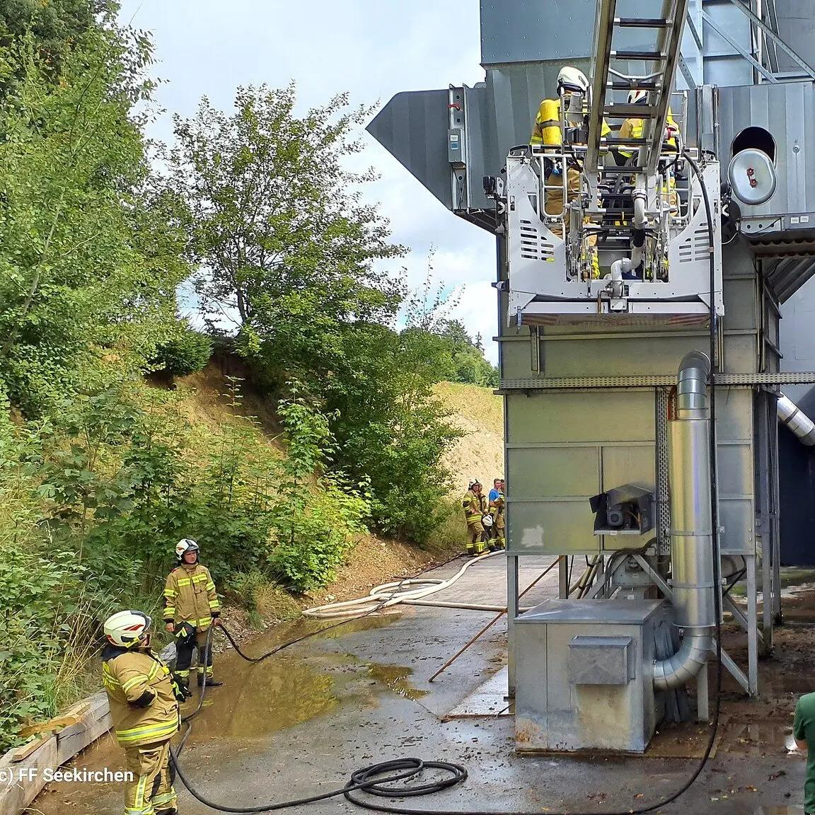Die Einsatzkräfte kühlten zunächst die betroffene Filtereinheit und fluteten sie anschließend mit Löschwasser, um mögliche Glutnester im Inneren abzulöschen und zu verhindern, dass sich das Feuer weiter ausbreitet. Parallel dazu errichtete der Löschzug Schöngumprechting eine Saugstelle am betriebseigenen Löschteich, um eine durchgehende Wasserversorgung während des Einsatzes sicherzustellen.
