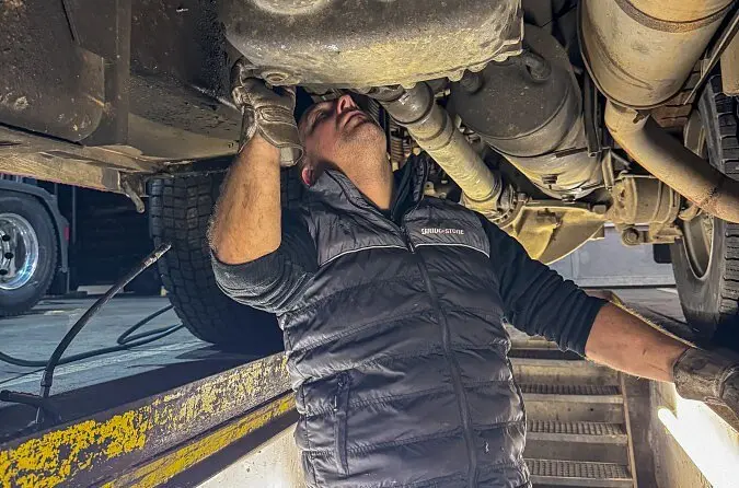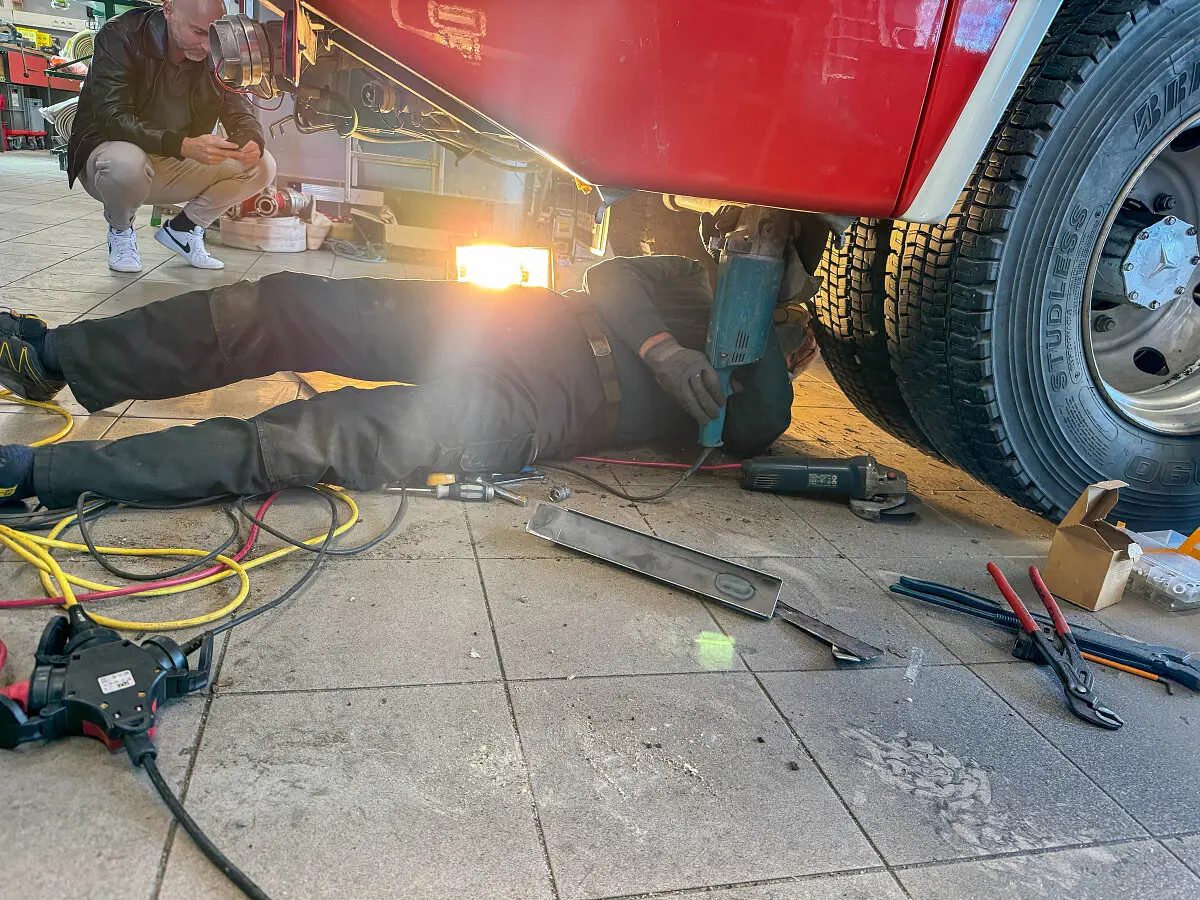 Feuerwehrkräfte aus Oberndorf bei Arbeiten an einem alten Rüstlöschfahrzeug.