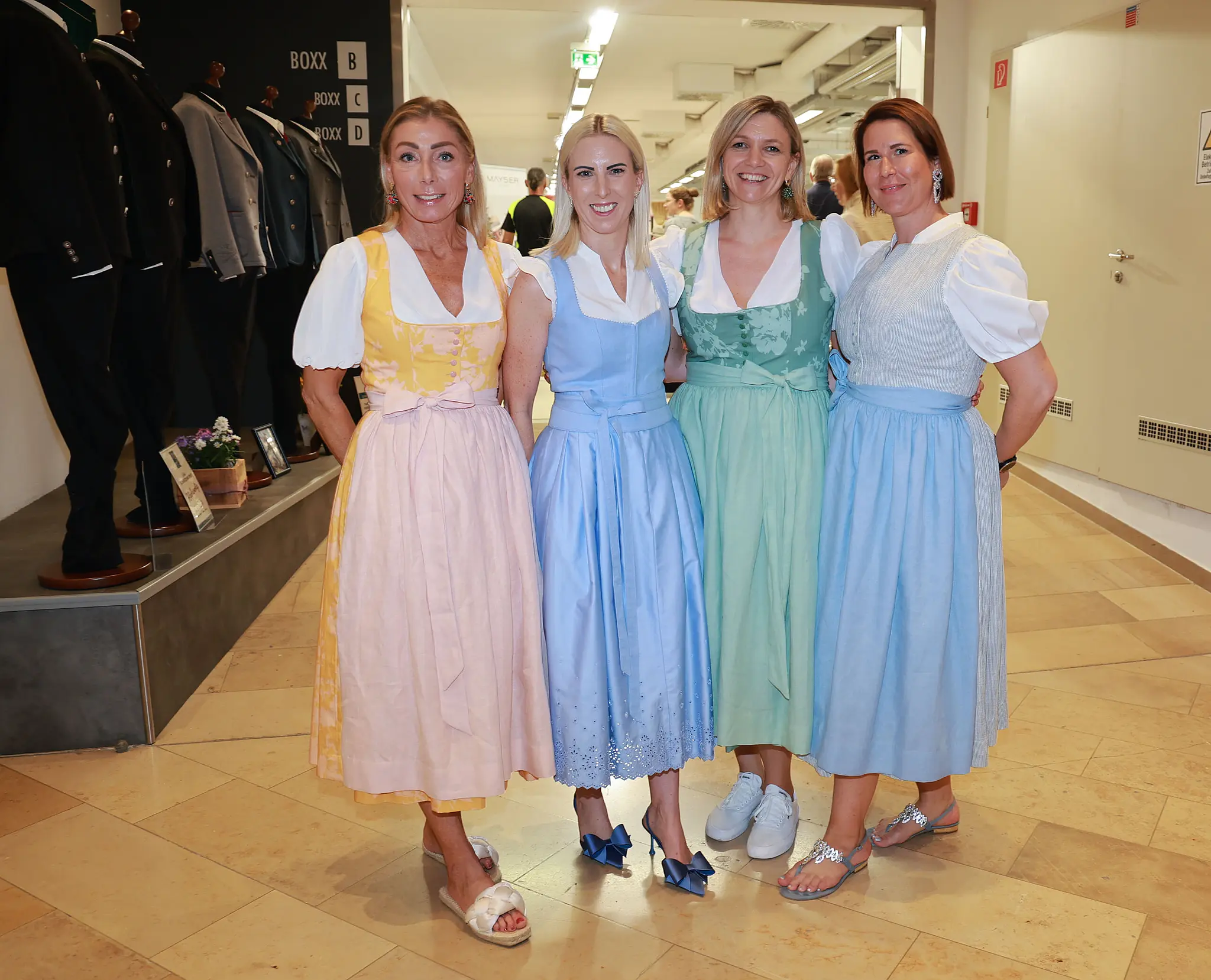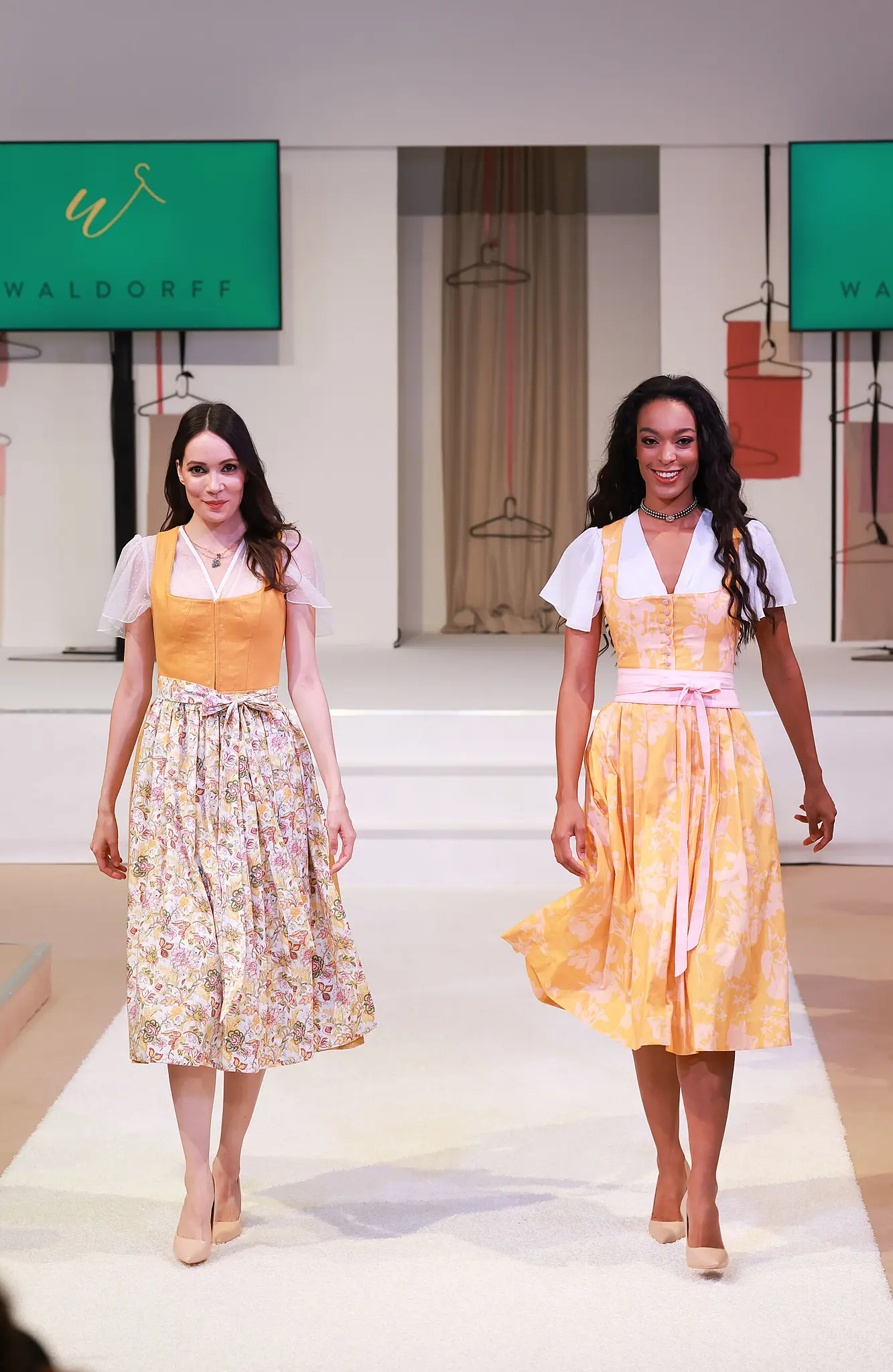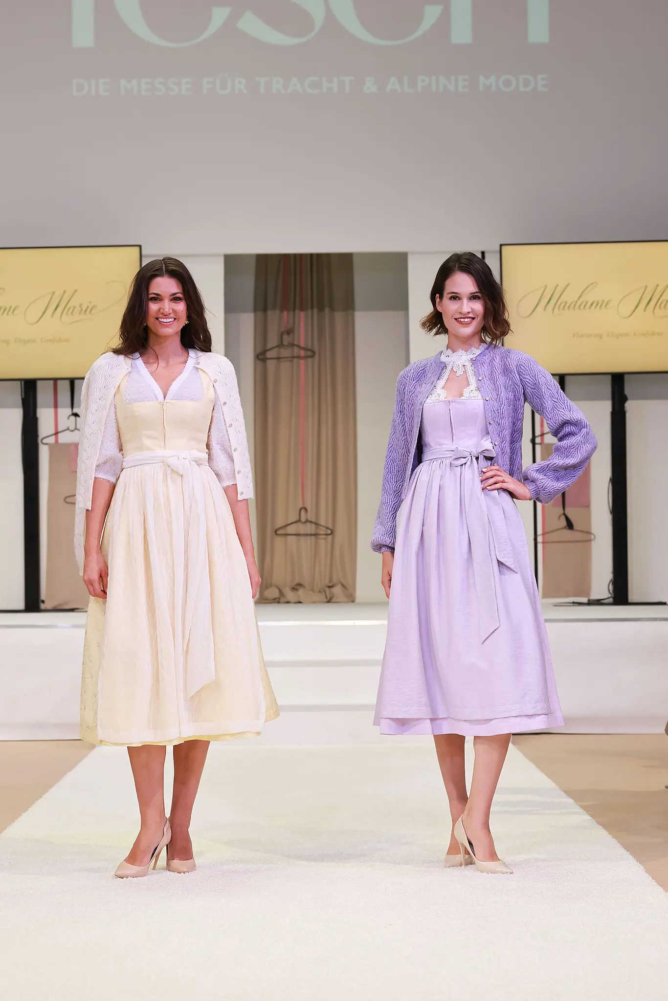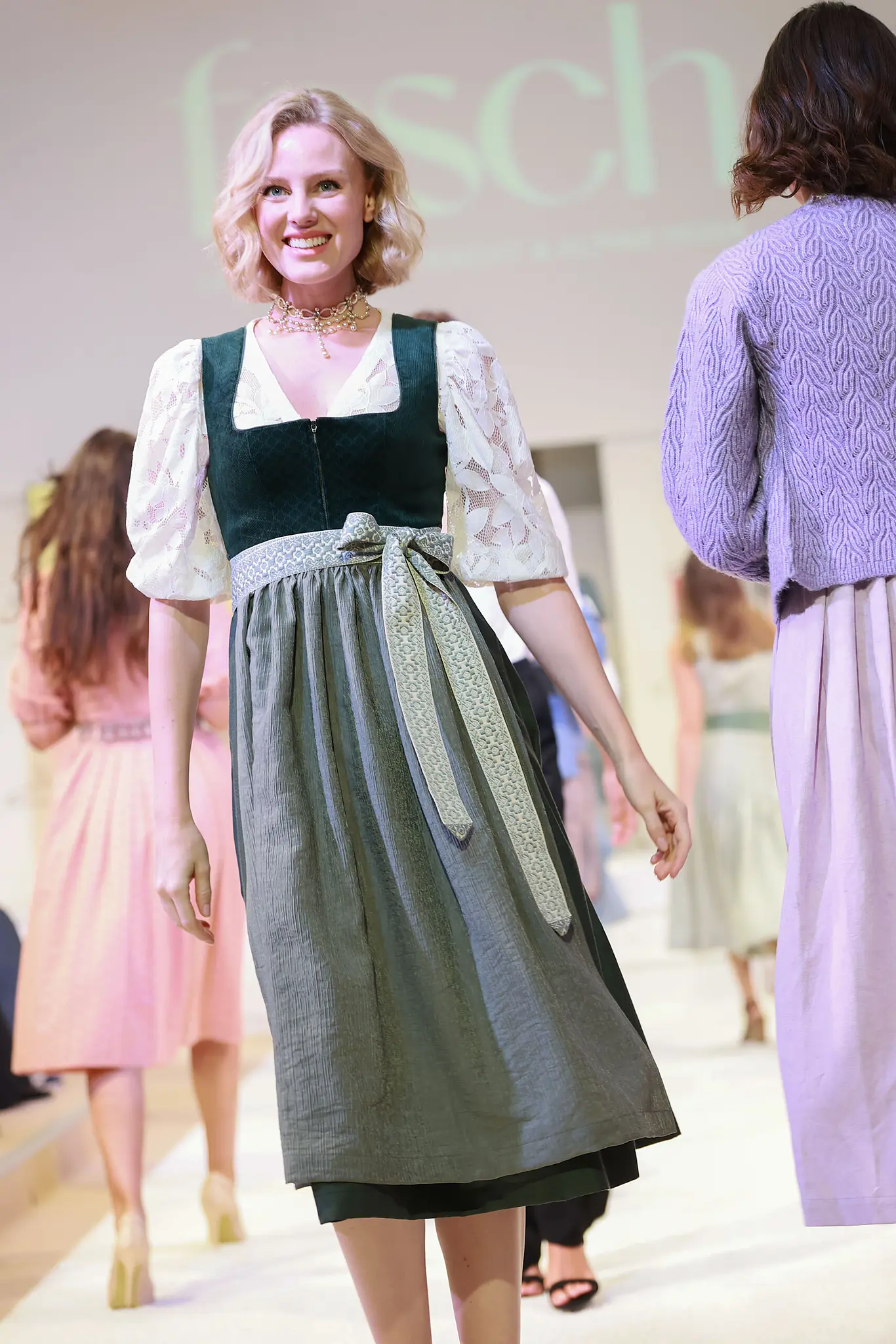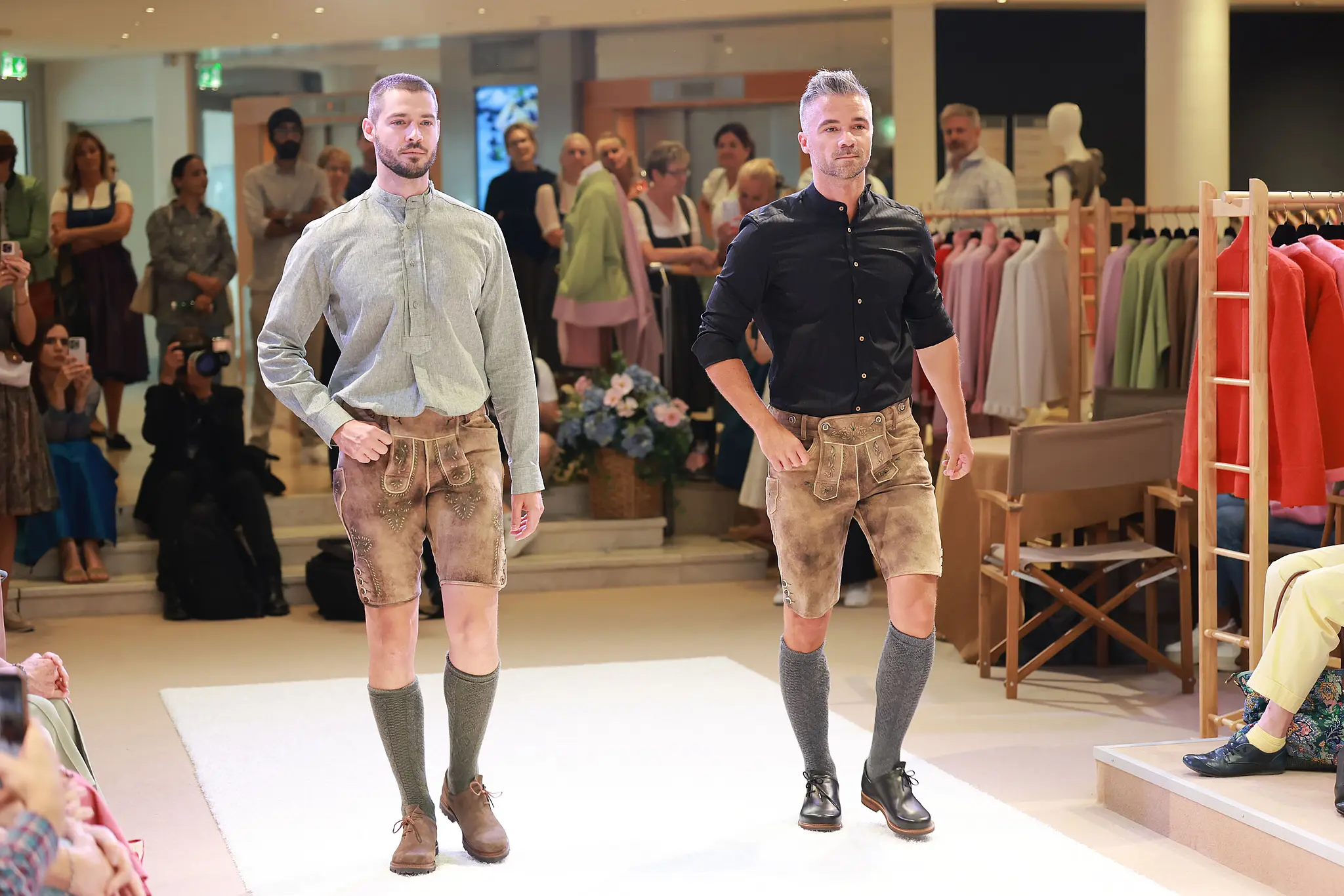Dirndlblusen bleiben weiterhin vielseitig. Ganz neu sind Modelle mit zartem Flor oder Fransenstruktur. Bei den Farben liegt Grün voll im Trend – von Salbei über Rasengrün bis zum modernen Jägerton. Bei den Männern sind reduzierte Stehkragensakkos angesagt.