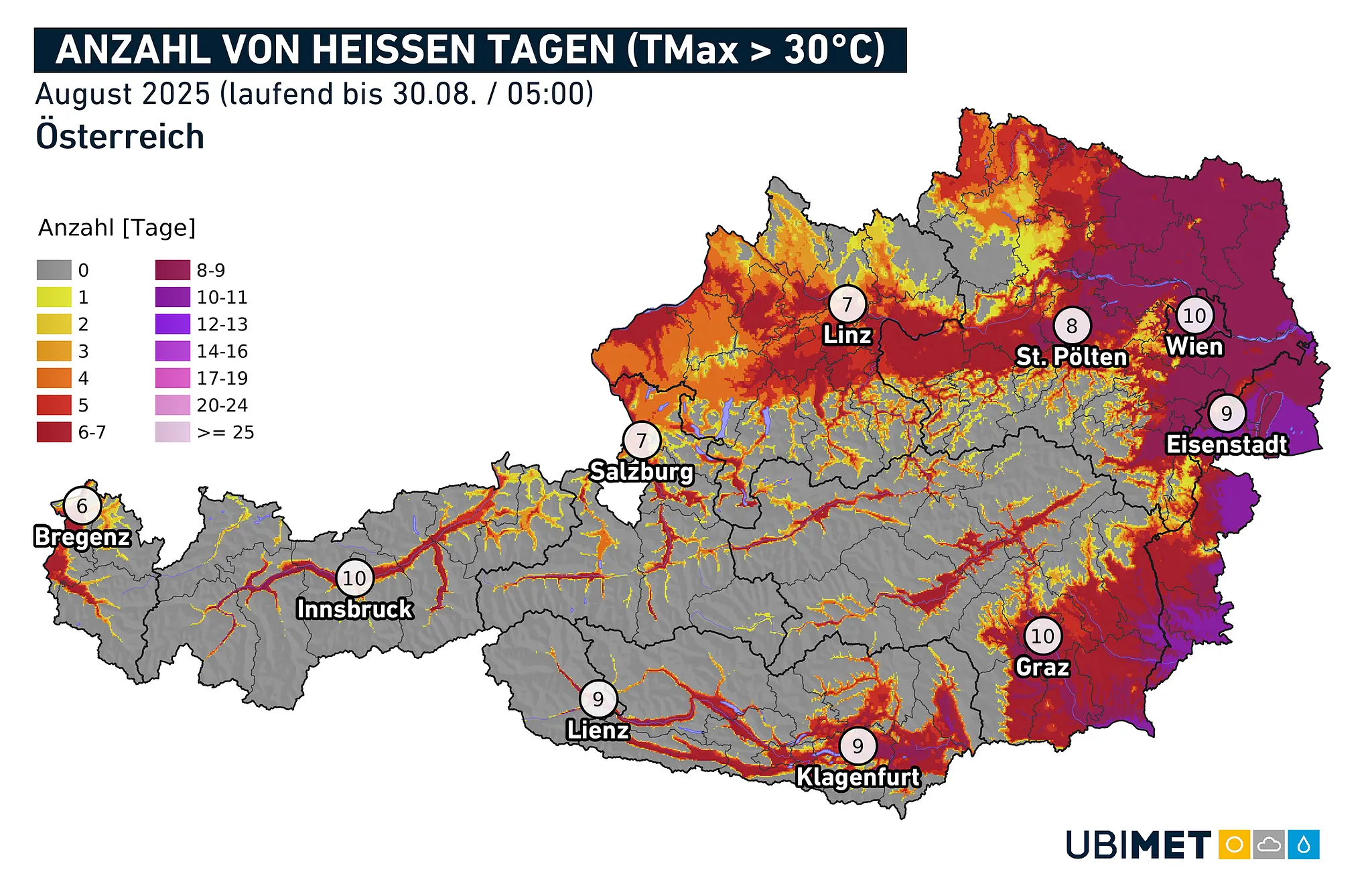 Mit 37 Grad wurde der Höchstwert Anfang des Monats in Güssing im Südburgenland gemessen, die Stadt kommt am Ende auf stolze zwölf Hitzetage – österreichweiter Spitzenwert. Normal sind im August hier laut Ubimet rund sieben Tage mit Temperaturen über 30 Grad.