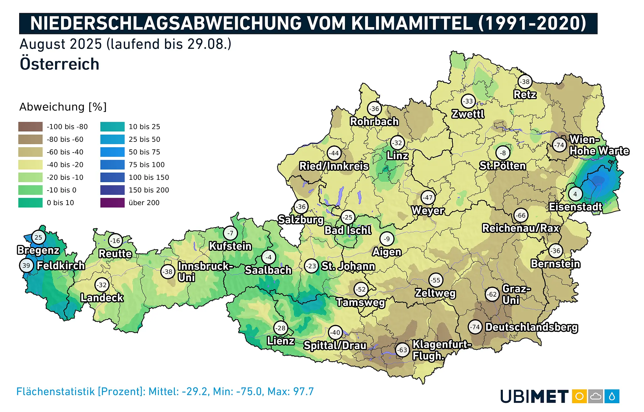 Markant war das Regendefizit demnach von Unterkärnten bis zum Waldviertel, in Graz fehlen rund 80 Prozent im Messkübel, 70 Prozent Minus sind es in Klagenfurt. So überrasche es nicht, dass mancherorts sogar der trockenste August seit Messbeginn hinter uns liegt. In Mattsee (Flachgau) fielen nur 61 Liter pro Quadratmeter (Messbeginn 1949), in St. Andrä im Lavanttal sogar lediglich 26 Liter pro Quadratmeter (Messbeginn 1961).