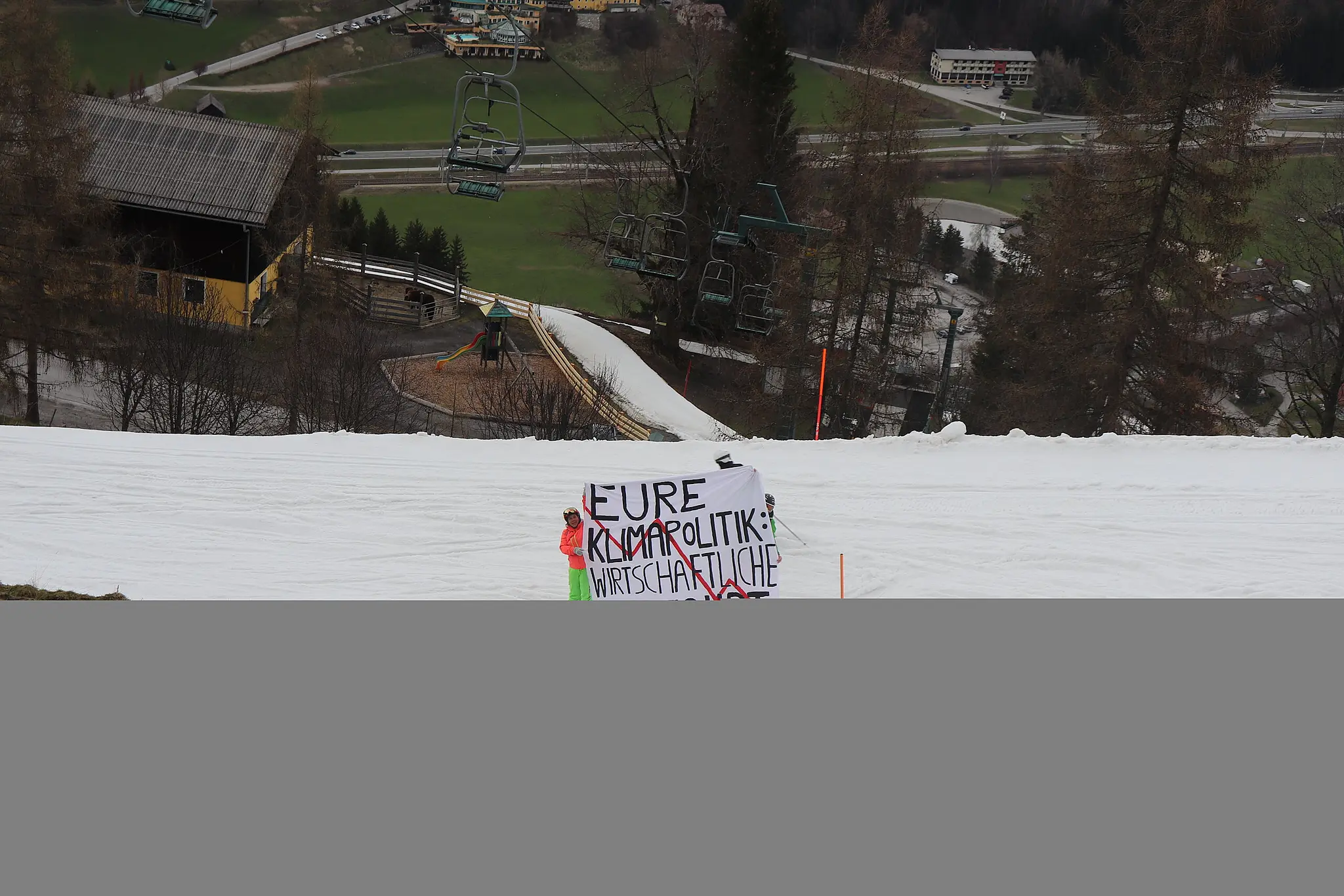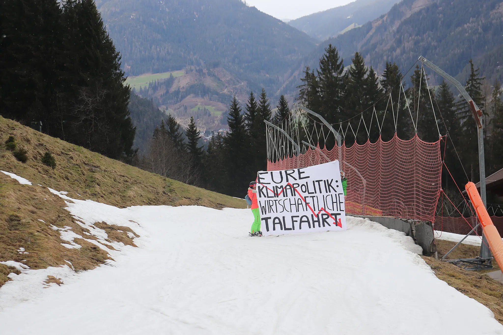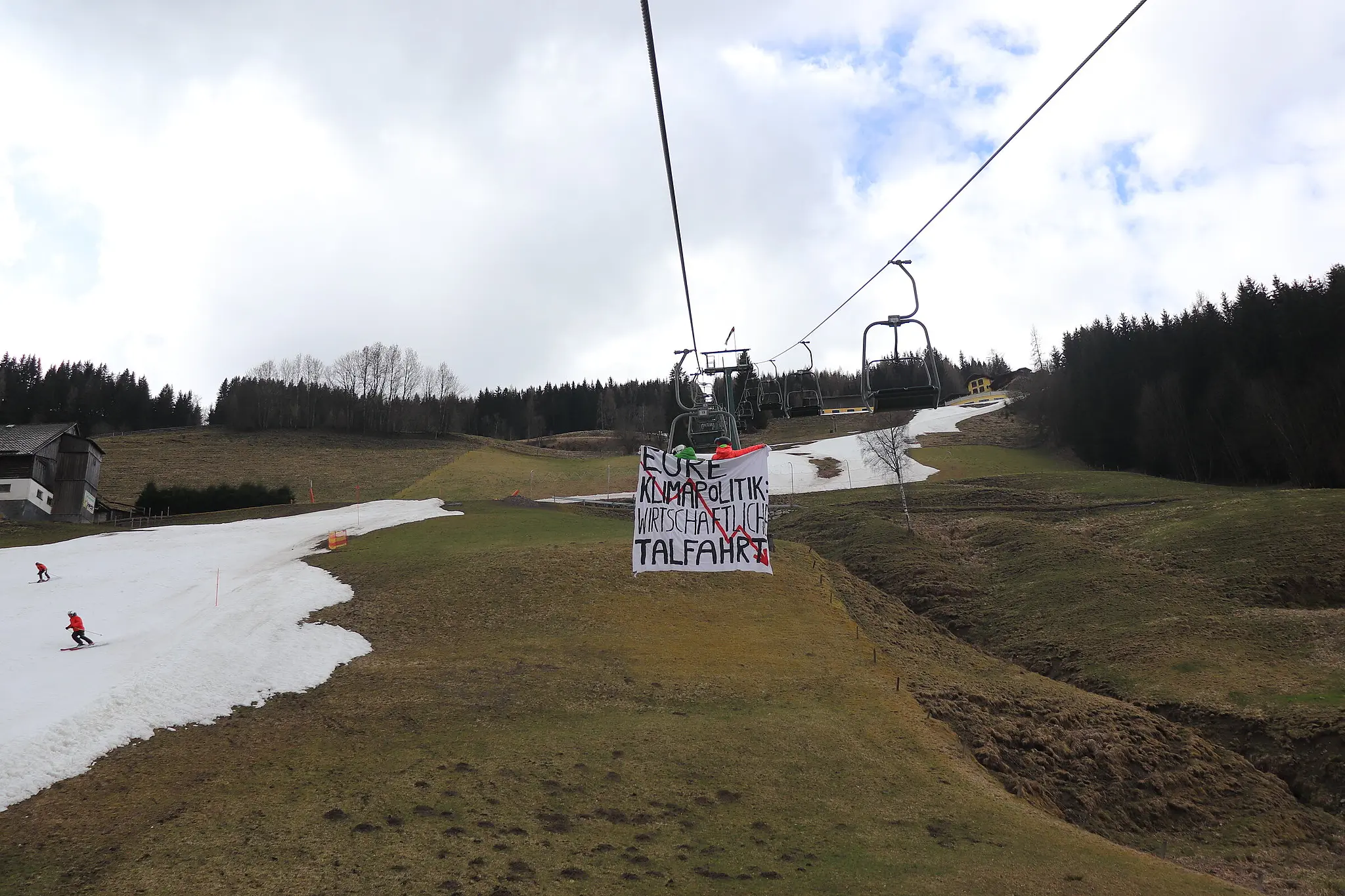 „Fridays For Future“-Aktivist:innen aus Salzburg haben heute eine Protestaktion auf einer Skipiste gestartet. Aus einem Sessellift ließen sie ein Banner mit der Aufschrift „Eure Klimapolitik: Wirtschaftliche Talfahrt“ hängen. Im Anschluss fuhren sie mit dem Transparent die Piste hinab. Sie wollen auf die immer geringer werdenden Schneemengen aufmerksam machen und fordern ein Umdenken, um den Skitourismus zu retten.