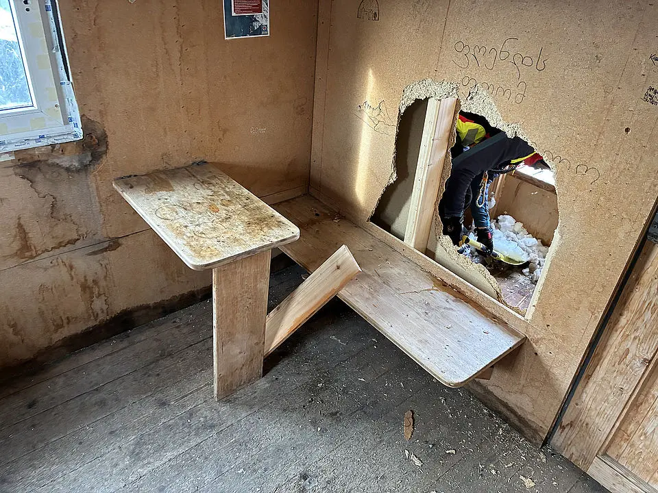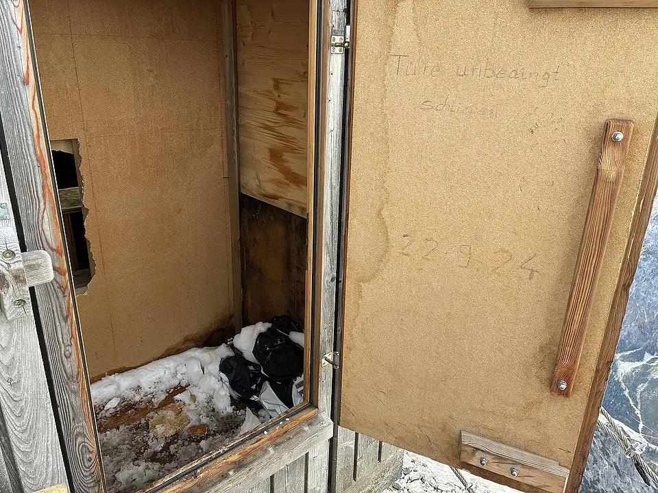 Ein bereits von einem Bergsteiger gemeldetes Loch in einer Zwischenwand war nur der Anfang: Vor Ort zeigte sich, dass unter anderem das Fenster des öffentlich zugänglichen Schutzraums eingeschlagen und die Holzwand durch eindringendes Regen- und Schmelzwasser stark beschädigt wurde. Auch das Schloss zum Materialdepot war mit massiver Gewalt zerstört worden – vermutlich mit einem Eispickel und Steigeisen. All das sei offenbar durch massive, mutwillige Gewalt entstanden, so Bereitschaftsleiter Michael Renner. Der Schaden beläuft sich demnach auf einen vierstelligen Betrag. Es ist das fünfte Mal binnen weniger Wochen, dass die Schutzhütte beschädigt wird.