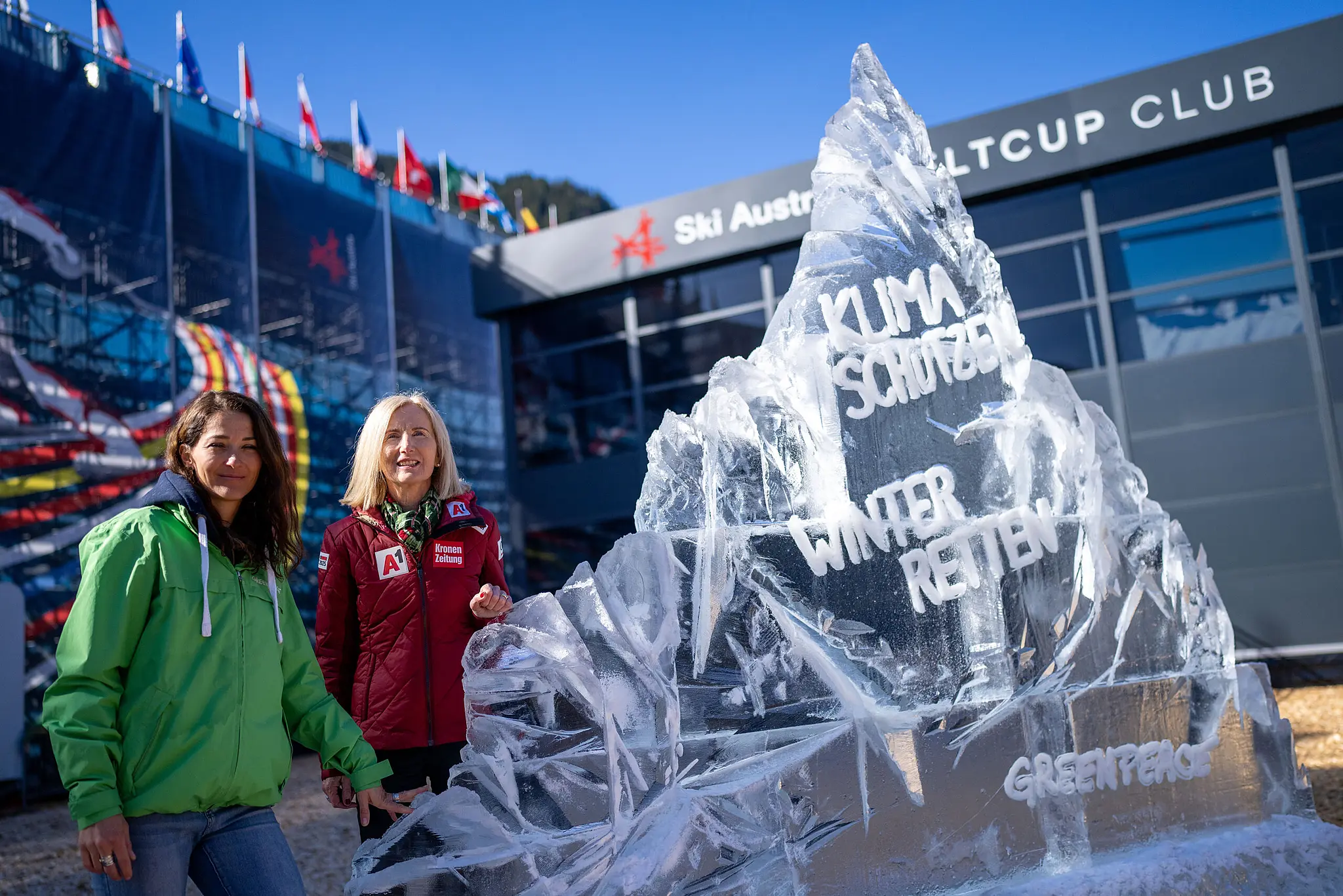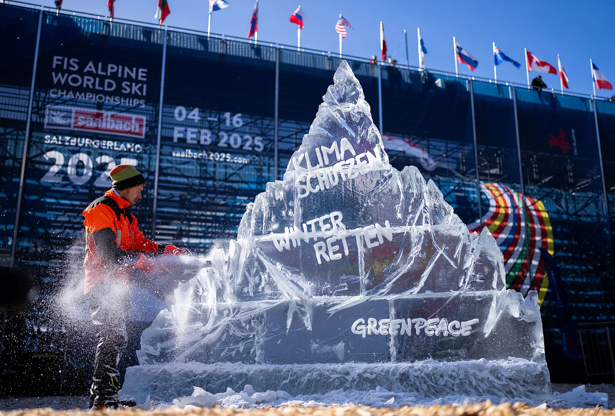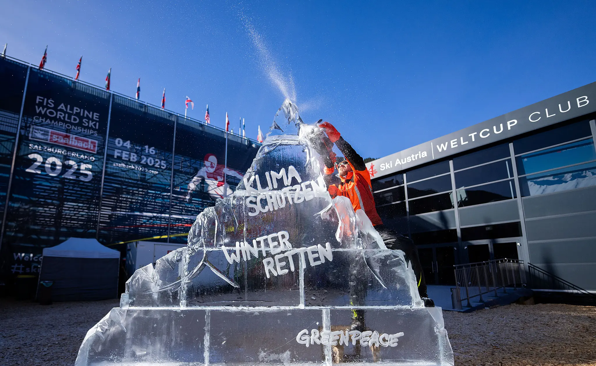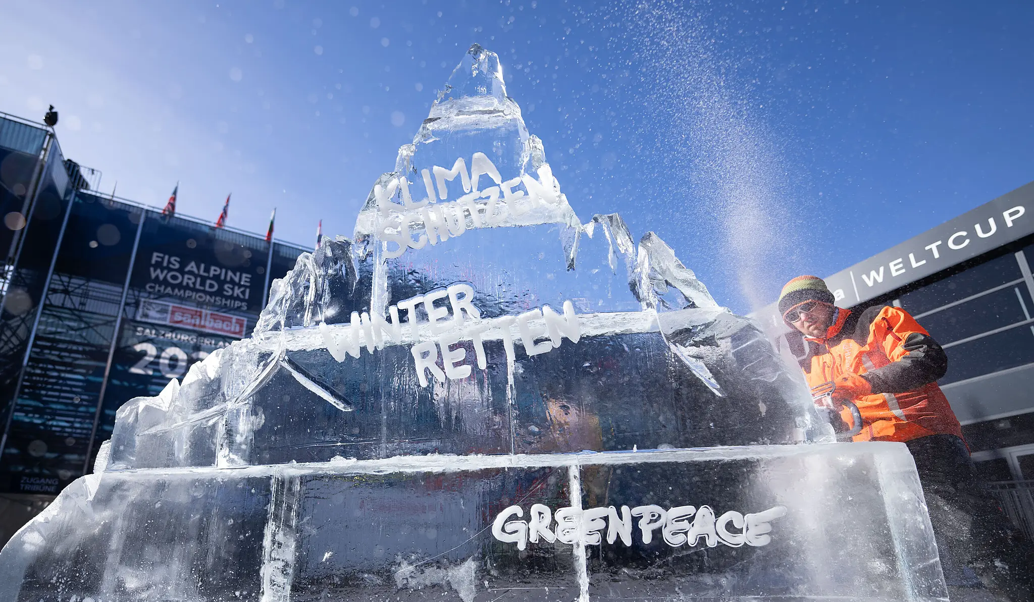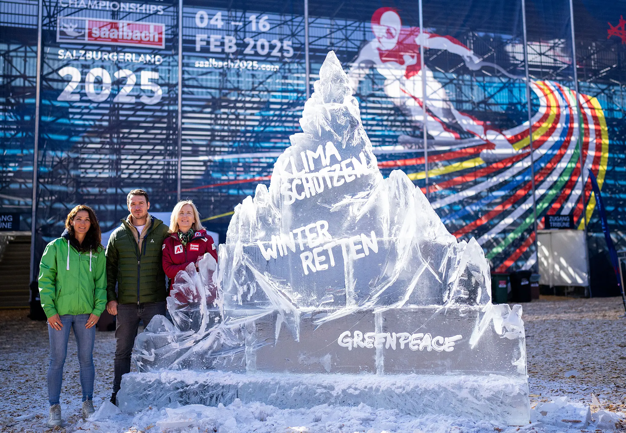 Mit einer Kunstinstallation aus Eis mit der Aufschrift "Klima schützen, Winter retten!" haben Greenpeace, der ÖSV und Ex-Ski-Ass Felix Neureuther am Mittwoch in Saalbach-Hinterglemm auf die Bedrohung des Wintersports durch die Klimakrise hingewiesen. "Wenn ich die Bilder von weißen Pisten auf grau-braunen Bergen sehe, blutet mir das Herz", sagte Neureuther. Der ÖSV will bis Sommer ein Zukunftsprogramm erarbeiten – Neureuther und Greenpeace sind mit ihrer Expertise dabei.