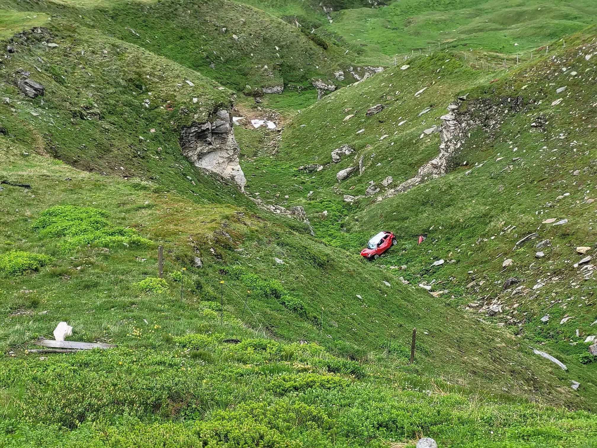 Auf dem Parkplatz "Fuscher Lacke" der Großglockner Hochalpenstraße ist Freitagnachmittag ein Auto 120 Meter abgestürzt. Es befand sich niemand im Auto, warum es in Bewegung geriet, ist unklar.