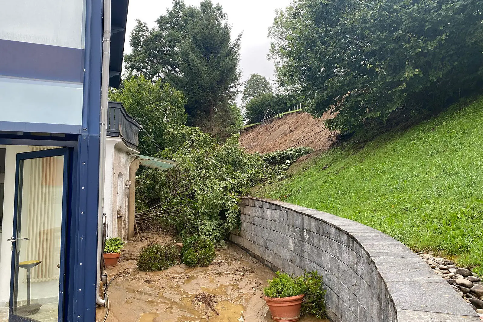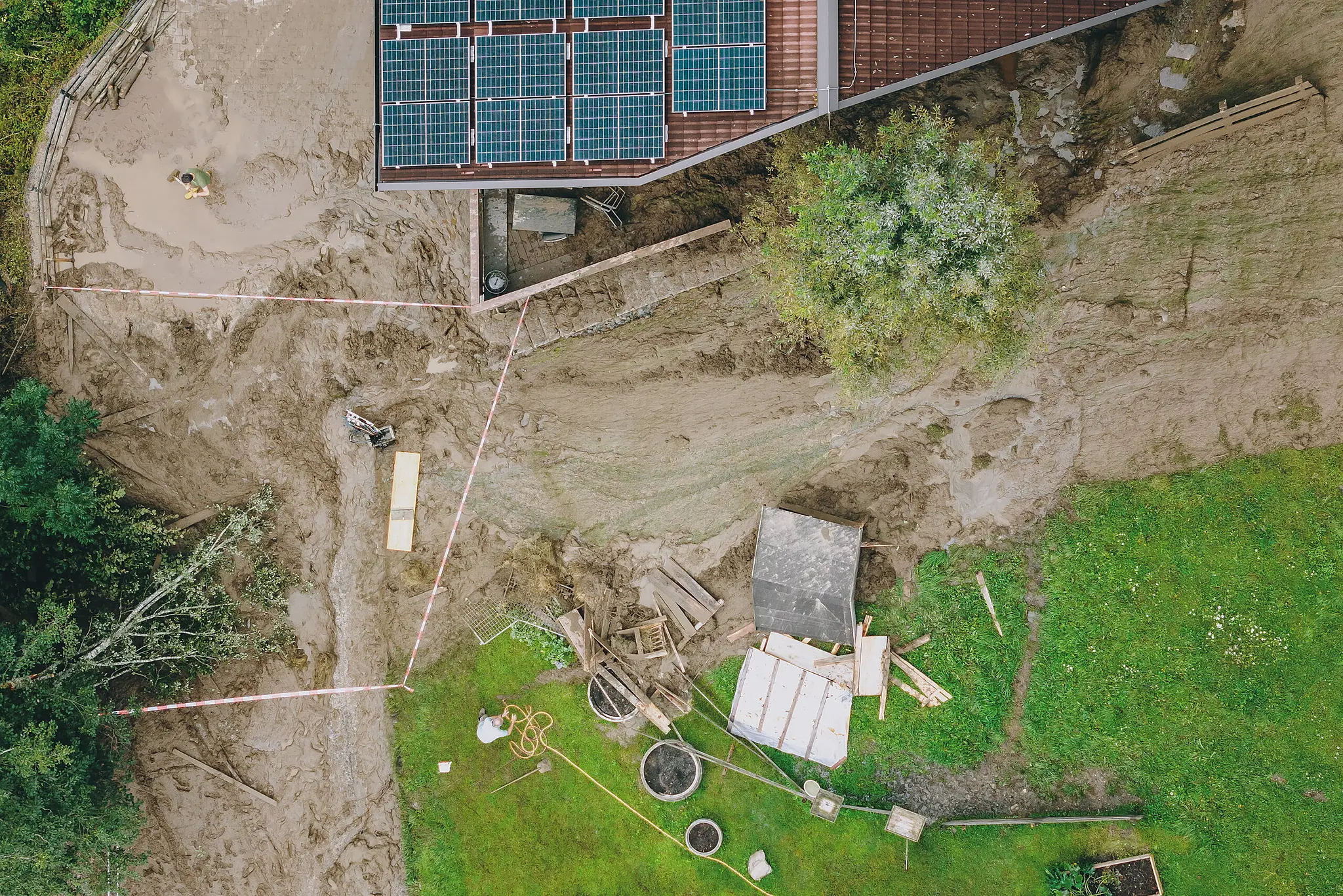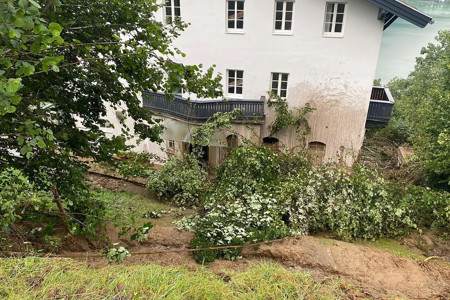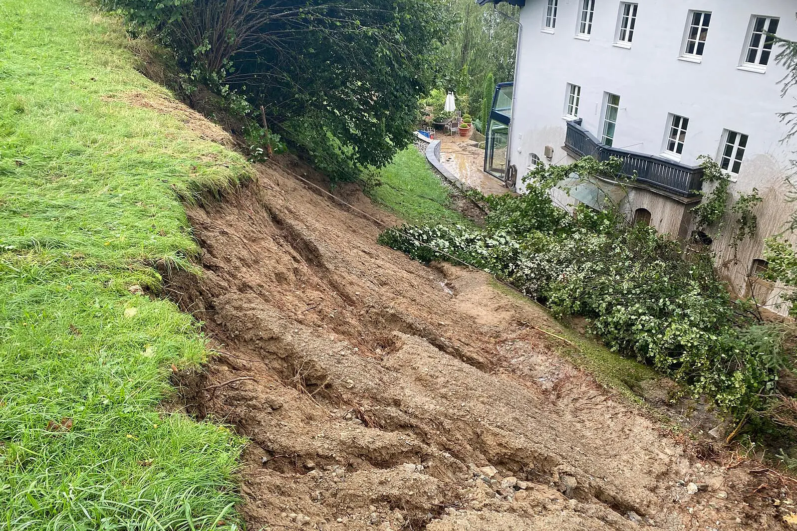 Zwei Häuser am Schaufelberg in Kaprun wurden von der Außenwelt abgeschnitten. Im Bild: Ein von einem Erdrutsch betroffenes Haus am Schaufelberg, aufgenommen am Sonntag, 18. August 2024, in Kaprun.