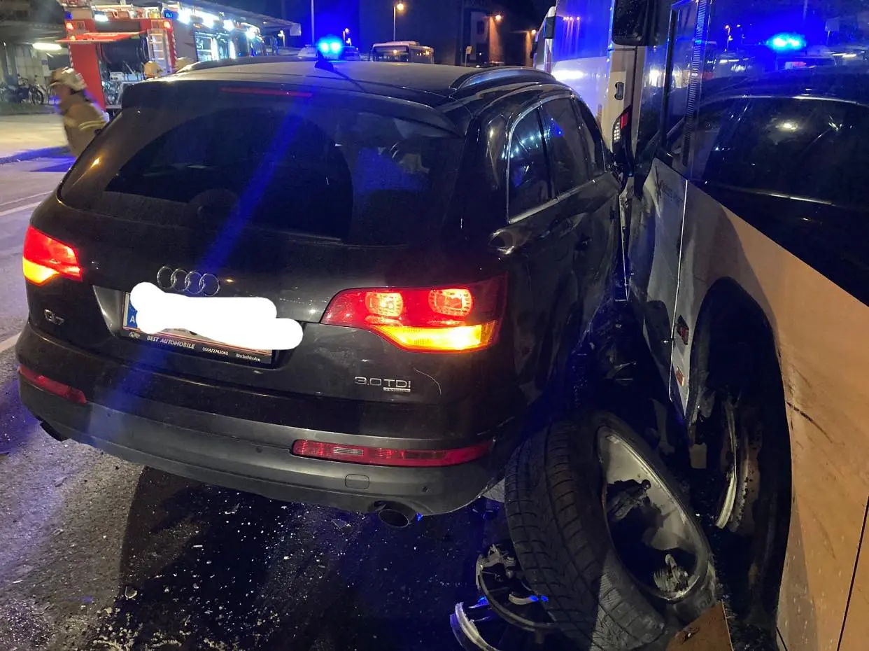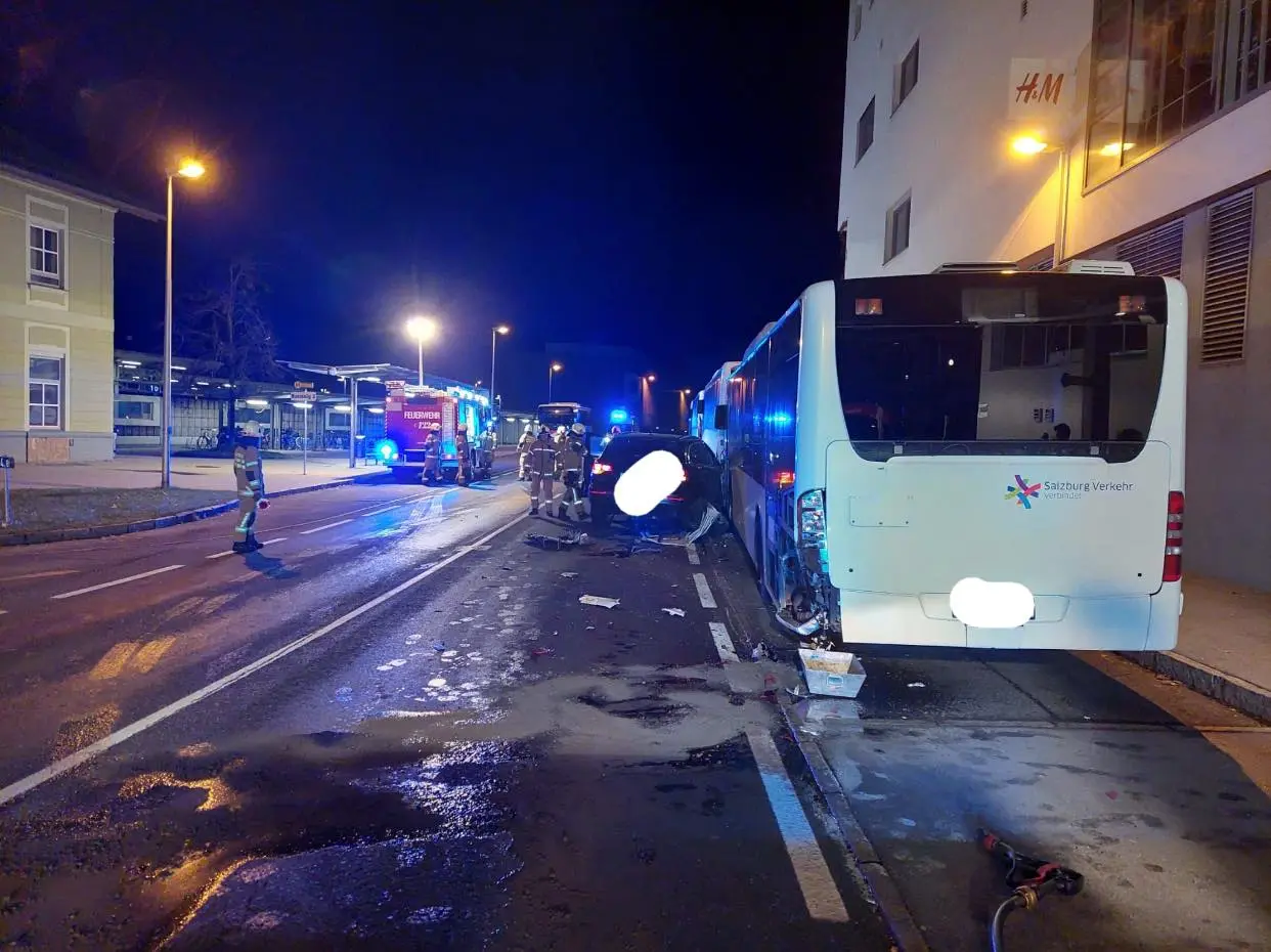 Nach der Erstversorgung durch die Einsatzkräfte des Roten Kreuzes wurden die beiden Verletzten in das Krankenhaus Schwarzach eingeliefert. Der Pkw sowie ein Bus wurden stark beschädigt und mussten abgeschleppt werden. Der Alkotest verlief negativ.