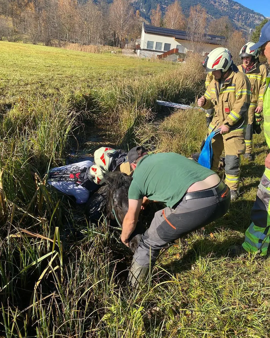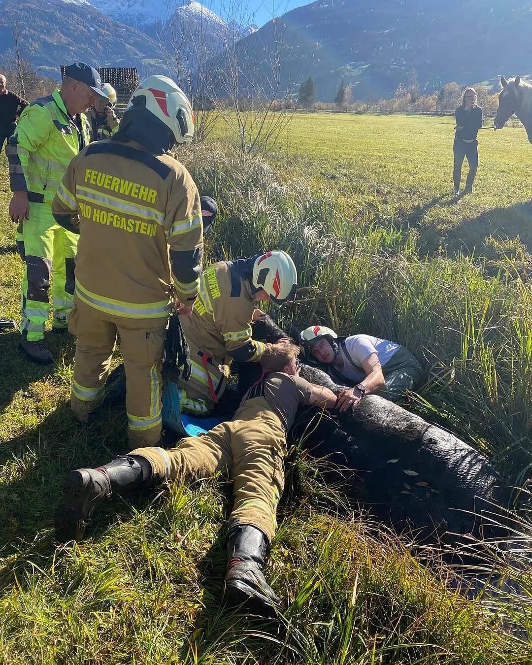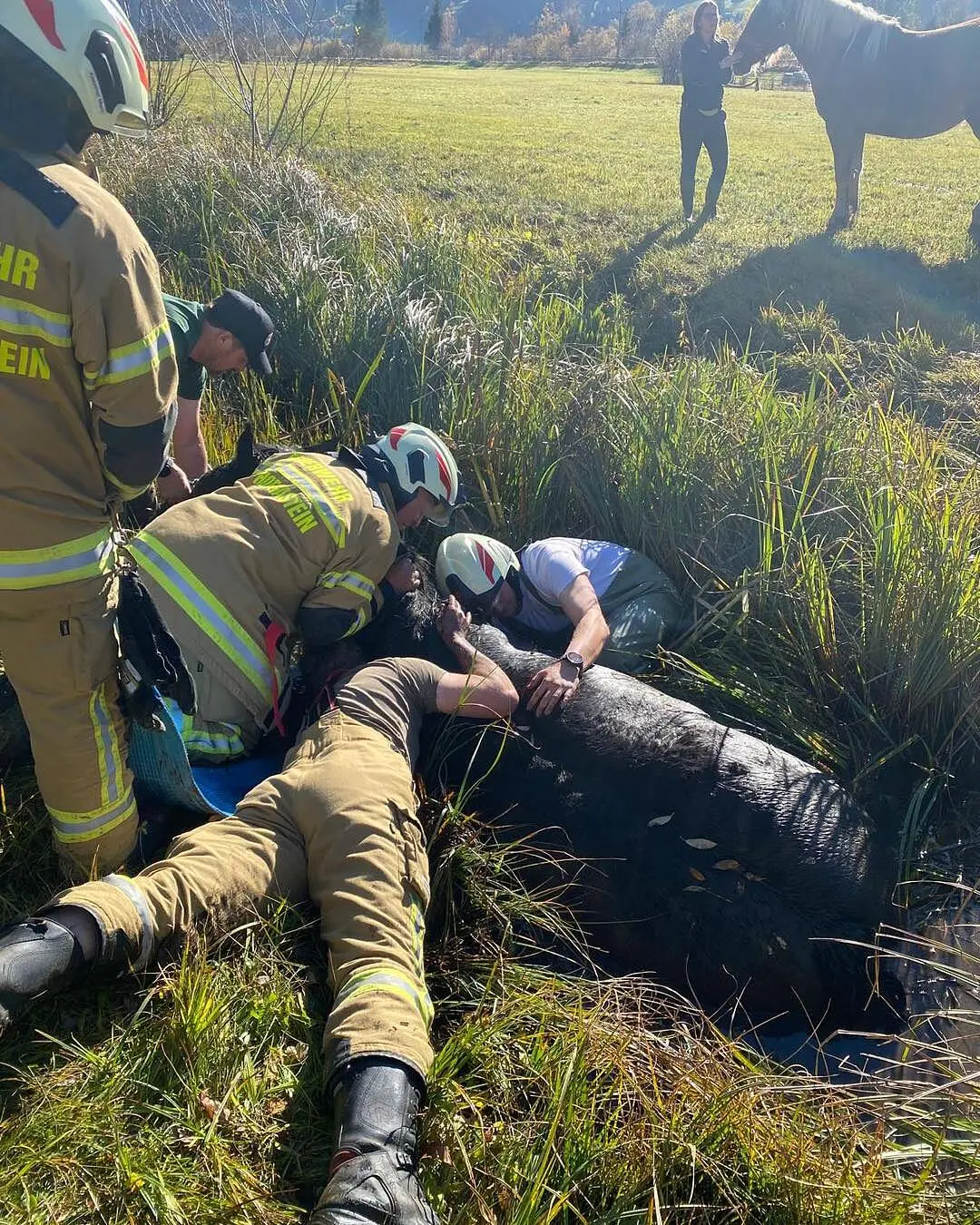 Zu einem tierischen Rettungseinsatz wurde am Mittwoch die Feuerwehr in Bad Hofgastein alarmiert. Eine Stute drohte in einem sumpfigen Wiesengraben zu versinken.