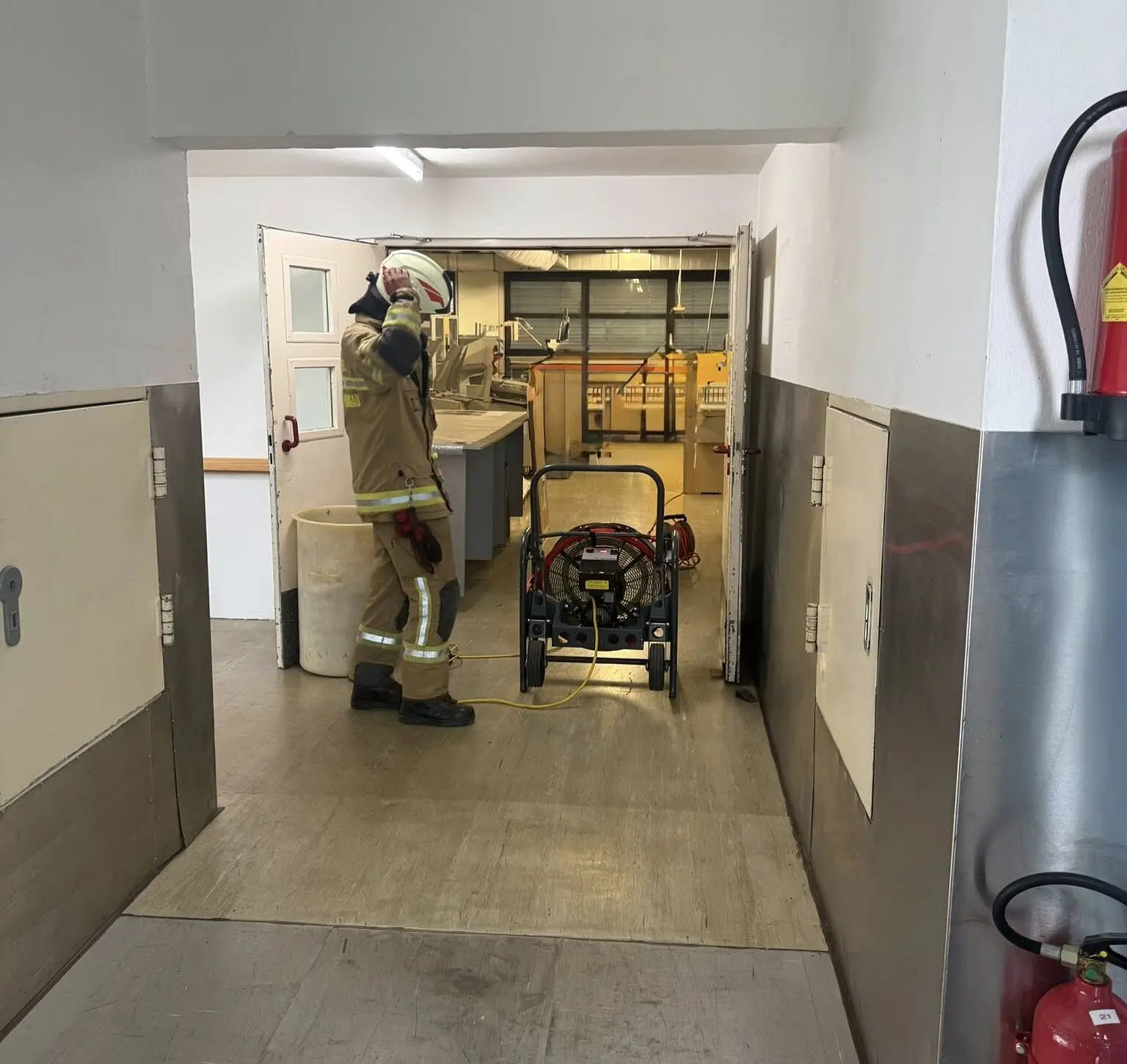 Beim Eintreffen der Einsatzkräfte stellte sich allerdings heraus, dass ein couragierter Mitarbeiter den Brand bereits mit einem Handfeuerlöscher gelöscht hatte. Die Aufgabe der Feuerwehr beschränkte sich daher auf die Nachschau und die Belüftung der Räumlichkeiten.