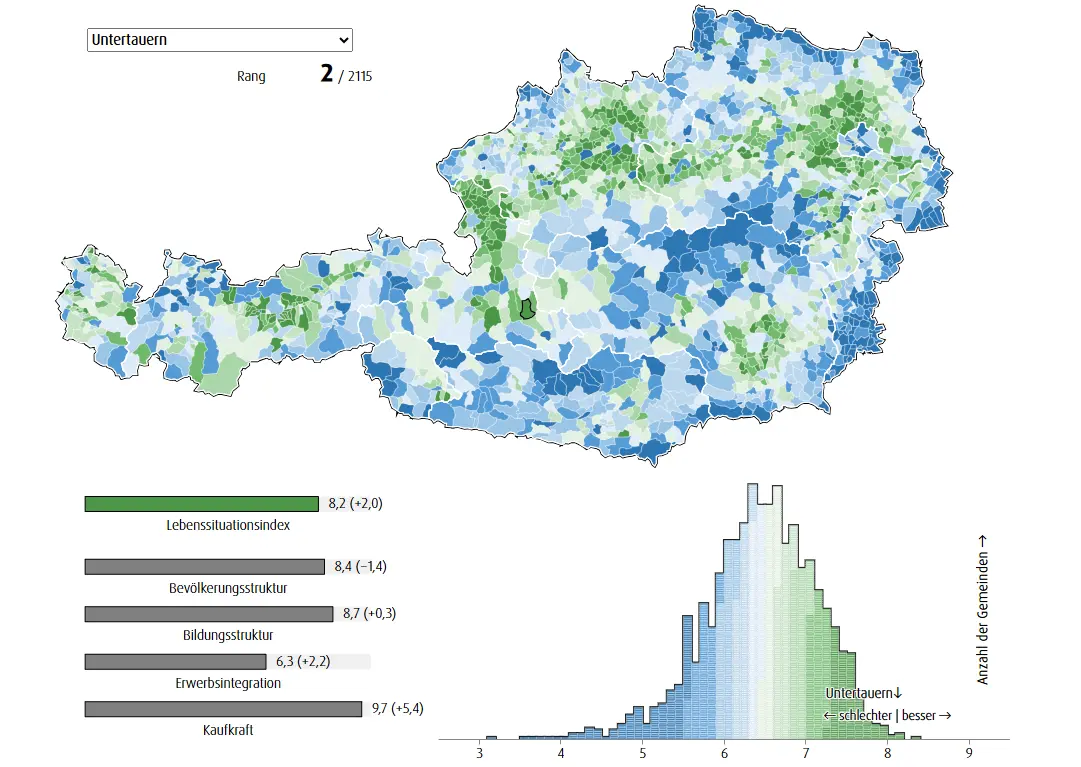 Wie ist die Lebenssituation in den österreichischen Gemeinden? Dieser Frage widmete das Österreichische Institut für Wirtschaftsforschung (Wifo) auch heuer wieder eine ganze Studie – und eine interaktive Landkarte. Diese zeigt drei Auffälligkeiten, wenn man auf Salzburg blickt. Erstens: Vor allem Salzburgs Norden ist deutlich grün gefärbt – die Lebenssituation dort wurde damit als tendenziell besser bewertet. Zweitens: Die Landeshauptstadt schneidet im Vergleich mit den umliegenden Gemeinden deutlich schlechter ab. Und drittens: Die Gemeinde Untertauern im Pongau zeichnet einen dunkelgrünen Fleck in den ansonsten eher blau bis hellgrünen Salzburger Süden und stellt mit 8,2 von 10 Punkten nicht nur die Salzburger Gemeinde mit dem besten Indexwert dar, sondern auch die zweitbeste im Österreich-Vergleich.