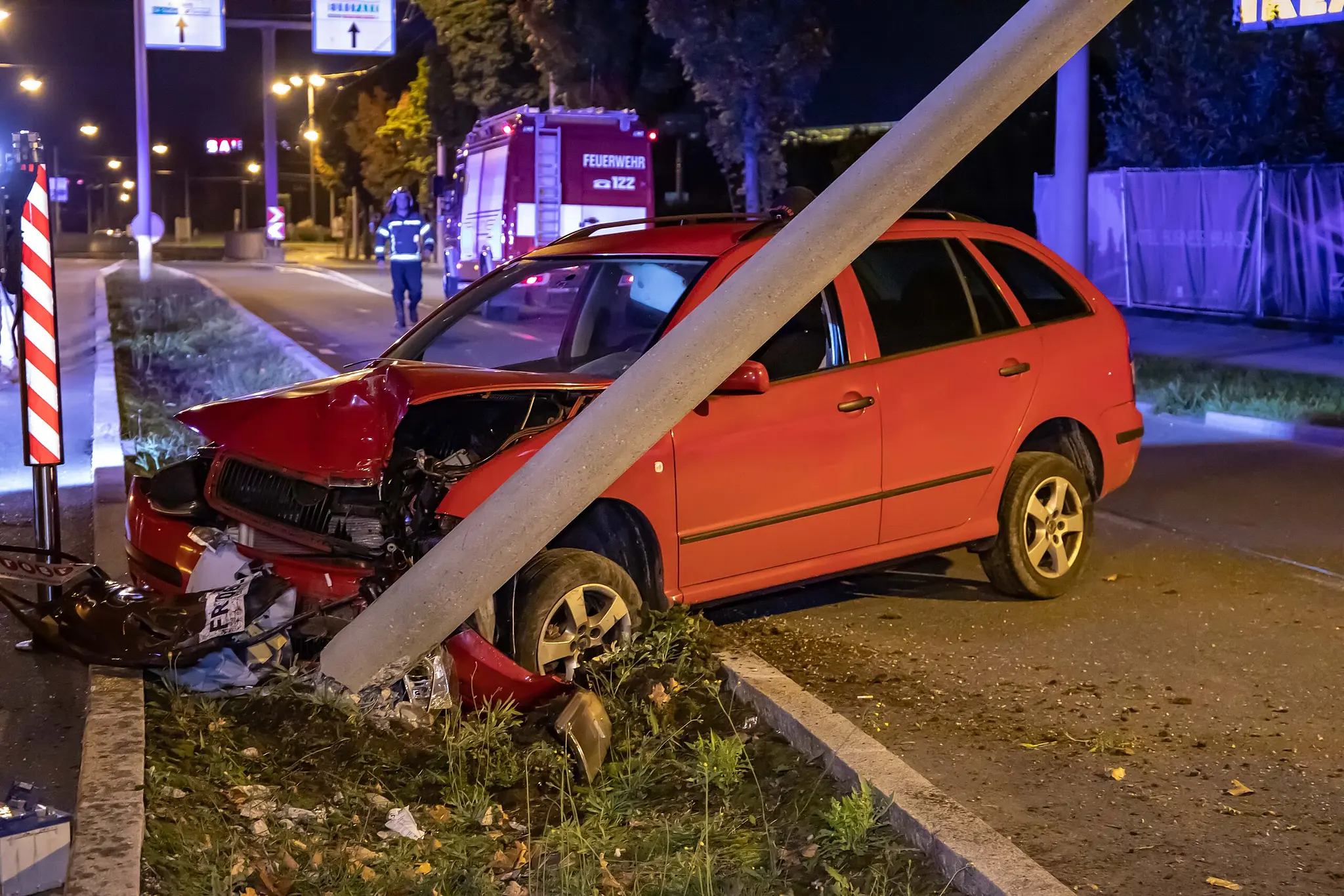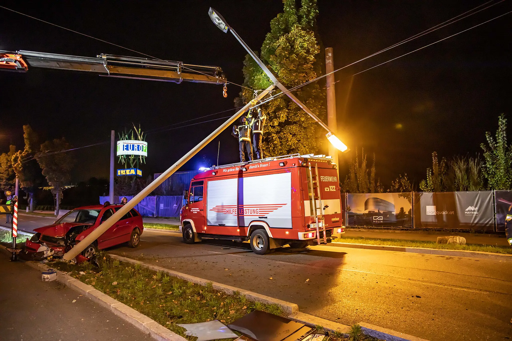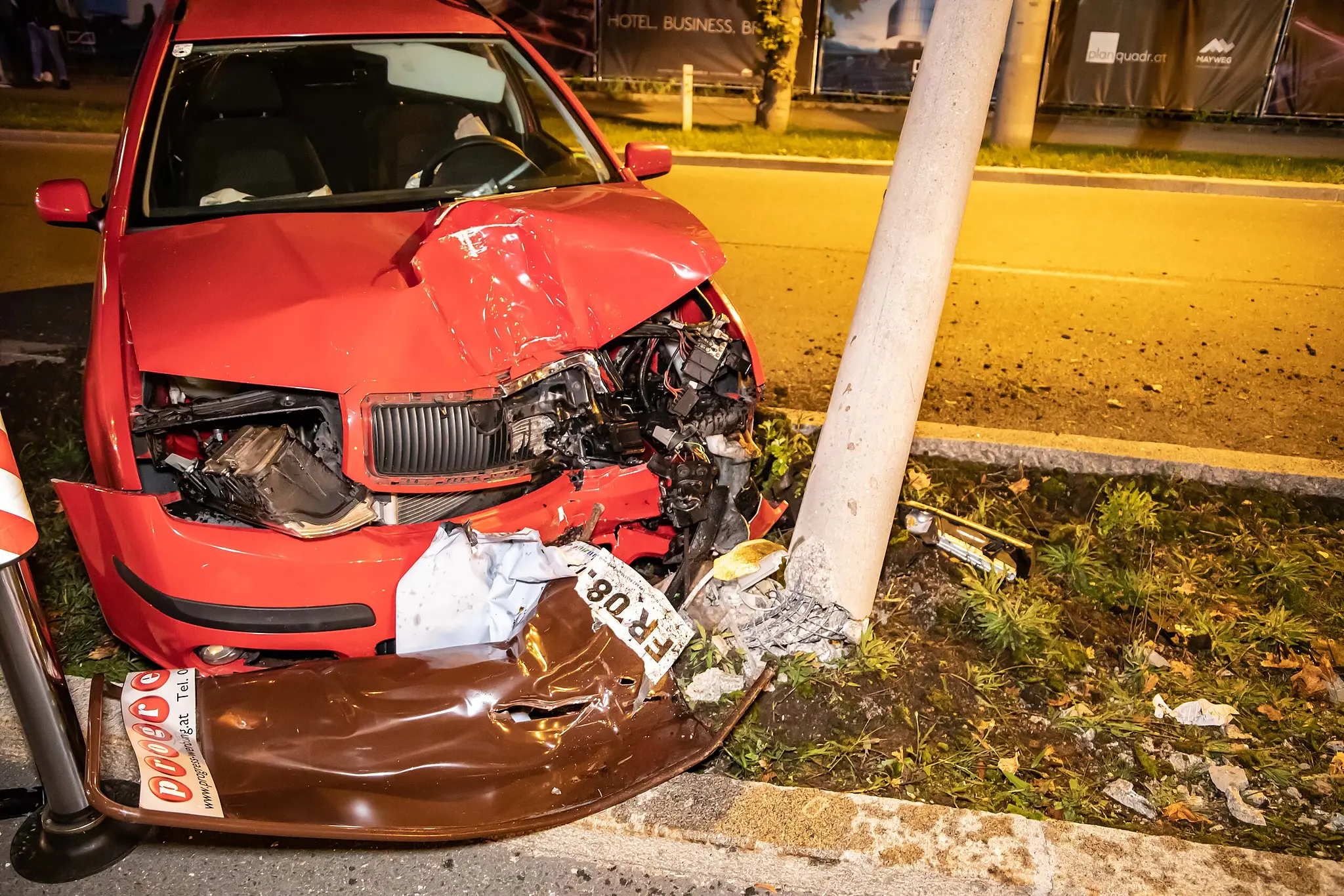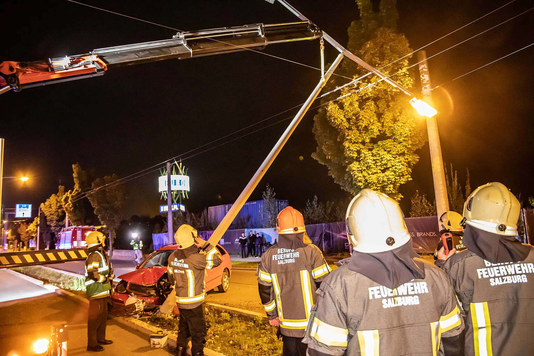 Beim Europark in der Stadt Salzburg krachte Montagnacht ein Pkw-Lenker mit seinem Fahrzeug gegen einen Laternenmast. Zwei Personen wurden dabei verletzt.