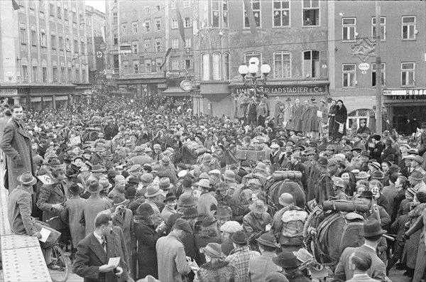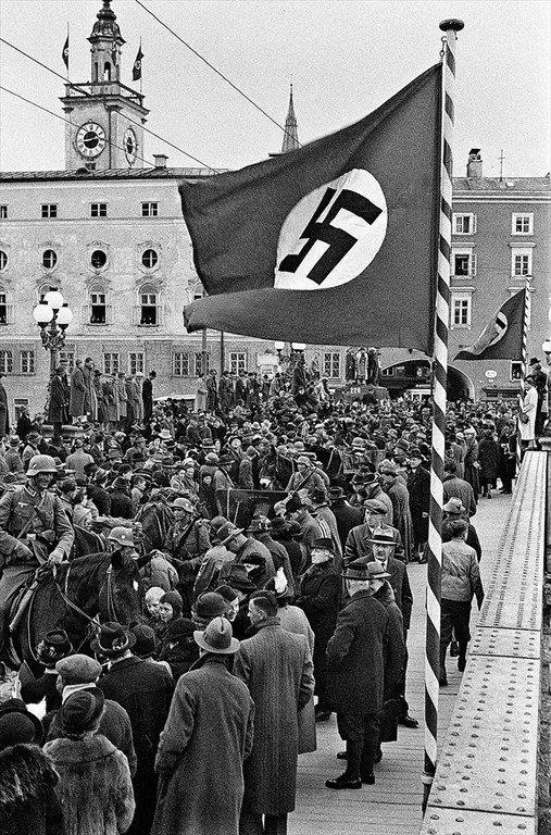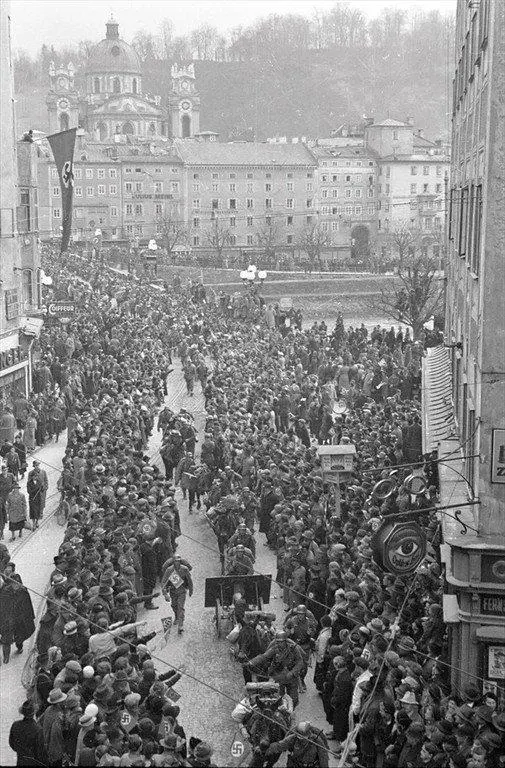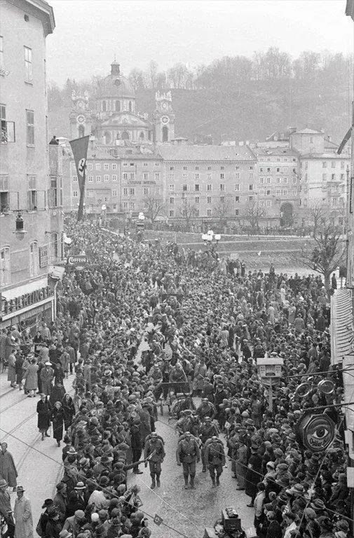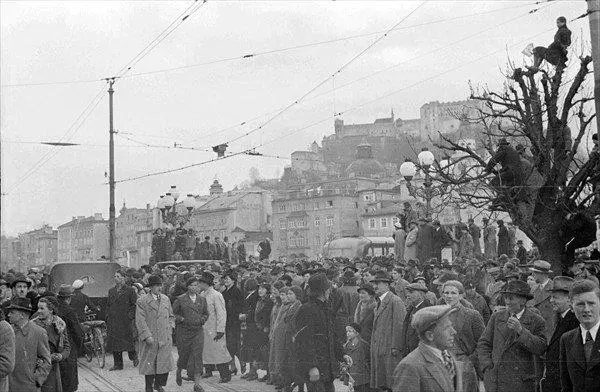 Am frühen Vormittag des 12. März trafen die ersten Panzerspitzen in der Stadt Salzburg ein. Um 10 Uhr 30 und 11 Uhr warfen Flugzeuge der deutschen Luftwaffe Flugzettel mit Grußbotschaft Hitlers über der Stadt ab. Die deutschen Truppen rückten unter dem brausenden Jubel der Bevölkerung in Salzburg ein. Große Mengen von NS-Fahnen und Armbinden waren mit Lastautos angeliefert worden und wurden an die Bevölkerung ausgegeben. Die Pressebilder Franz Kriegers, die am Nachmittag des 12. März aufgenommen wurden, zeigen die deutschen Truppen auf der Staatsbrücke und am Platzl, neuralgischen Punkten, an denen besonders viele Menschen zusammengeströmt waren.