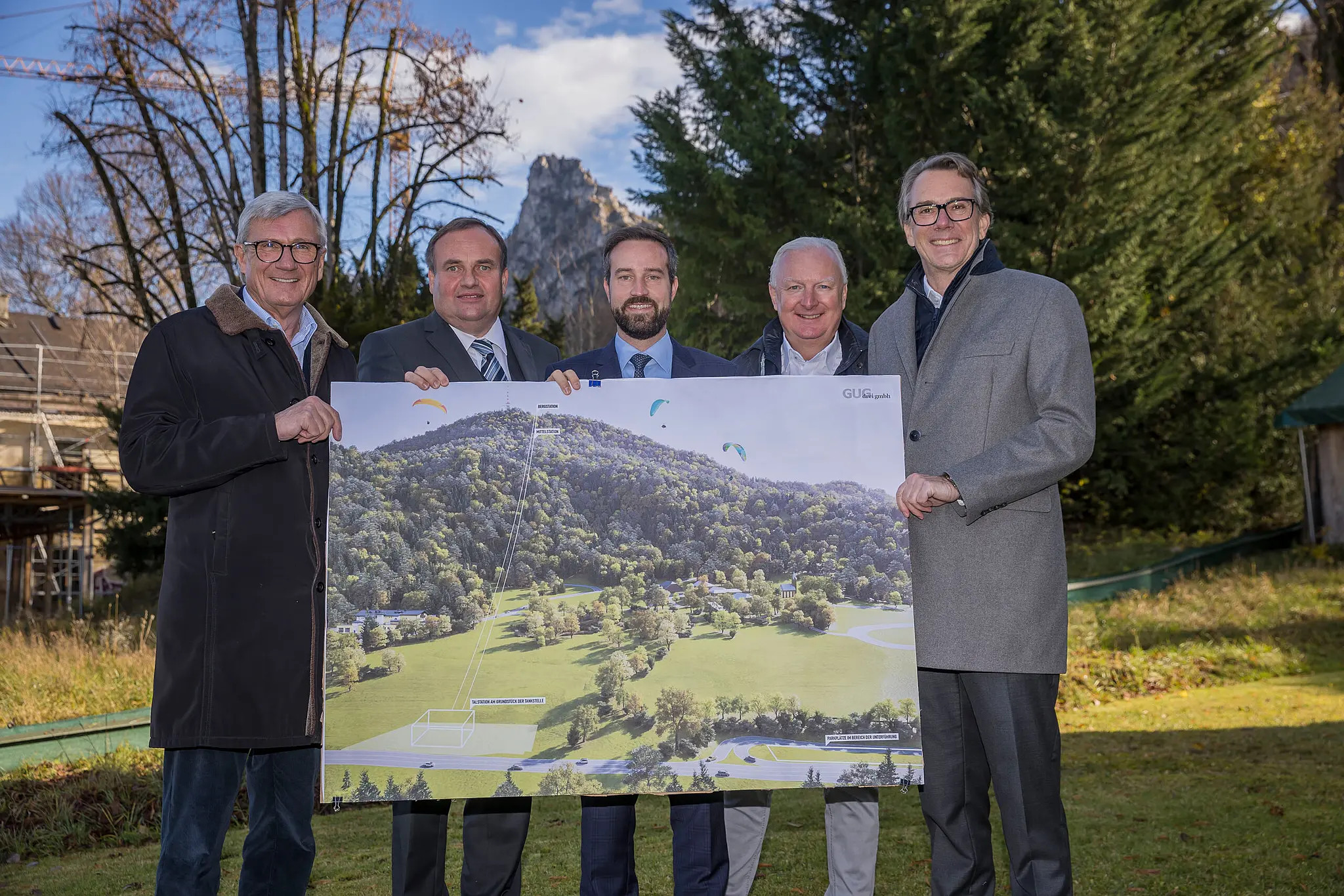 Hinter der Projektidee steht die "GUG drei GmbH", ein Firmengeflecht mehrerer Investoren aus Salzburg und Oberösterreich, welches derzeit das denkmalgeschützte Gut Guggenthal in der Gemeinde Koppl (Flachgau) unweit der geplanten Talstation revitalisiert. "Die Vorarbeiten für das Projekt laufen seit rund eineinhalb Jahren", sagte am Donnerstag der Sprecher der Unternehmensgruppe, der Anwalt Christoph Bamberger, in einer Pressekonferenz. Derzeit fänden Abstimmungsgespräche mit Behörden und Naturschutz statt, im Bereich der geplanten Bergstation seien noch Vorgespräche mit Landesumweltanwaltschaft und Behörden ausständig.