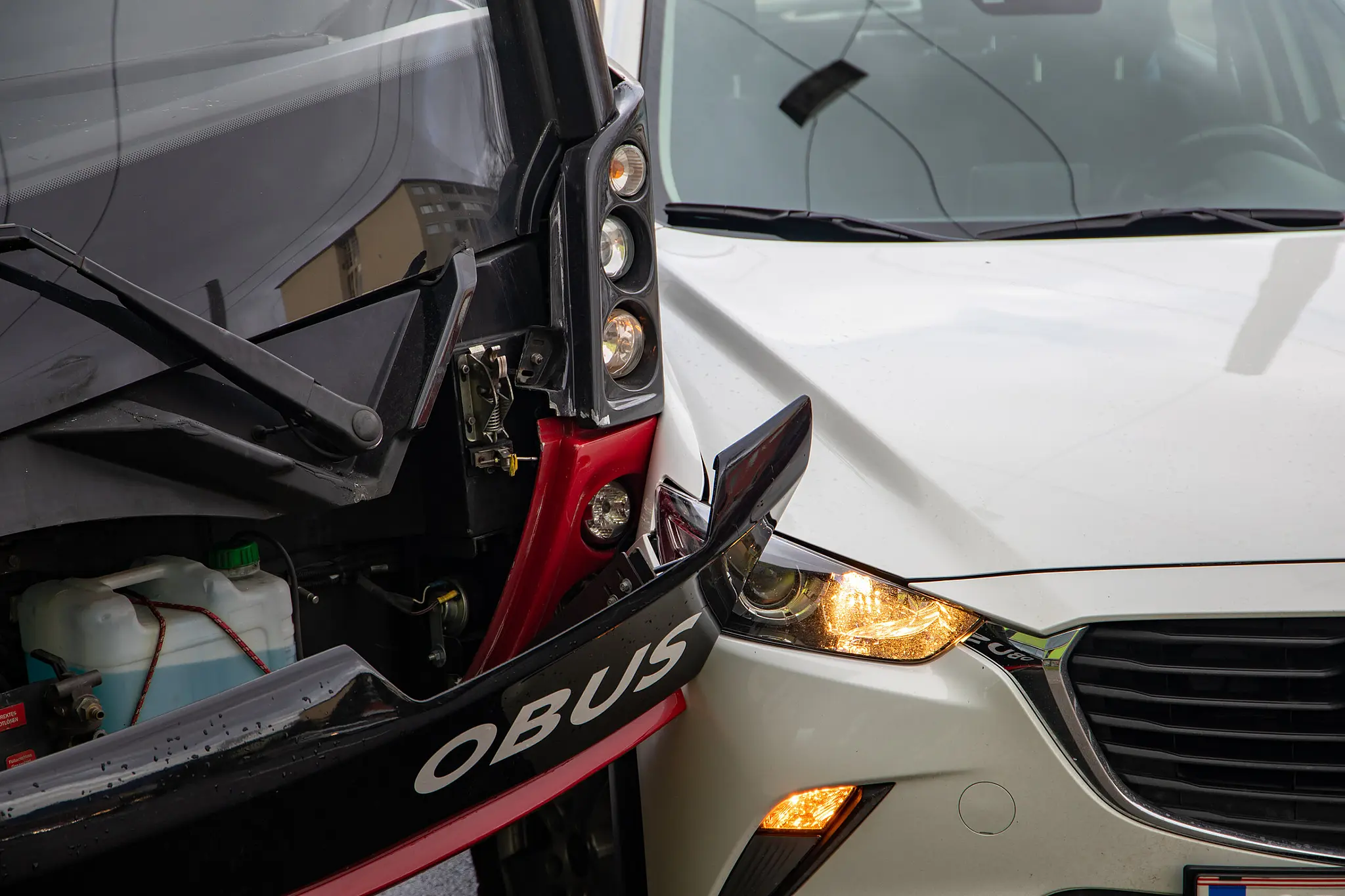 In der Ignaz-Harrer-Straße prallte ein Pkw in einen Obus.