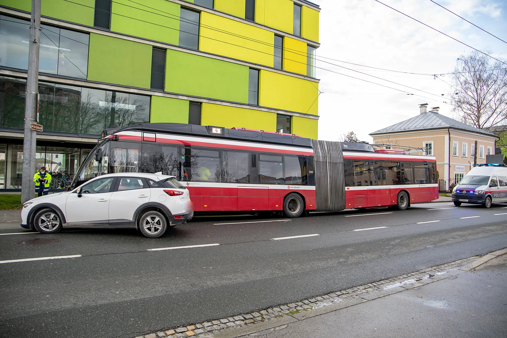 Der Pkw-Lenker wollte offenbar sein Fahrzeug wenden und dürfte dabei den Obus übersehen haben, teilt ein Fotograf vor Ort gegenüber SALZBURG24 mit. Beim Zusammenprall wurde der Obus im vorderen Bereich einige Zentimeter weit angehoben.