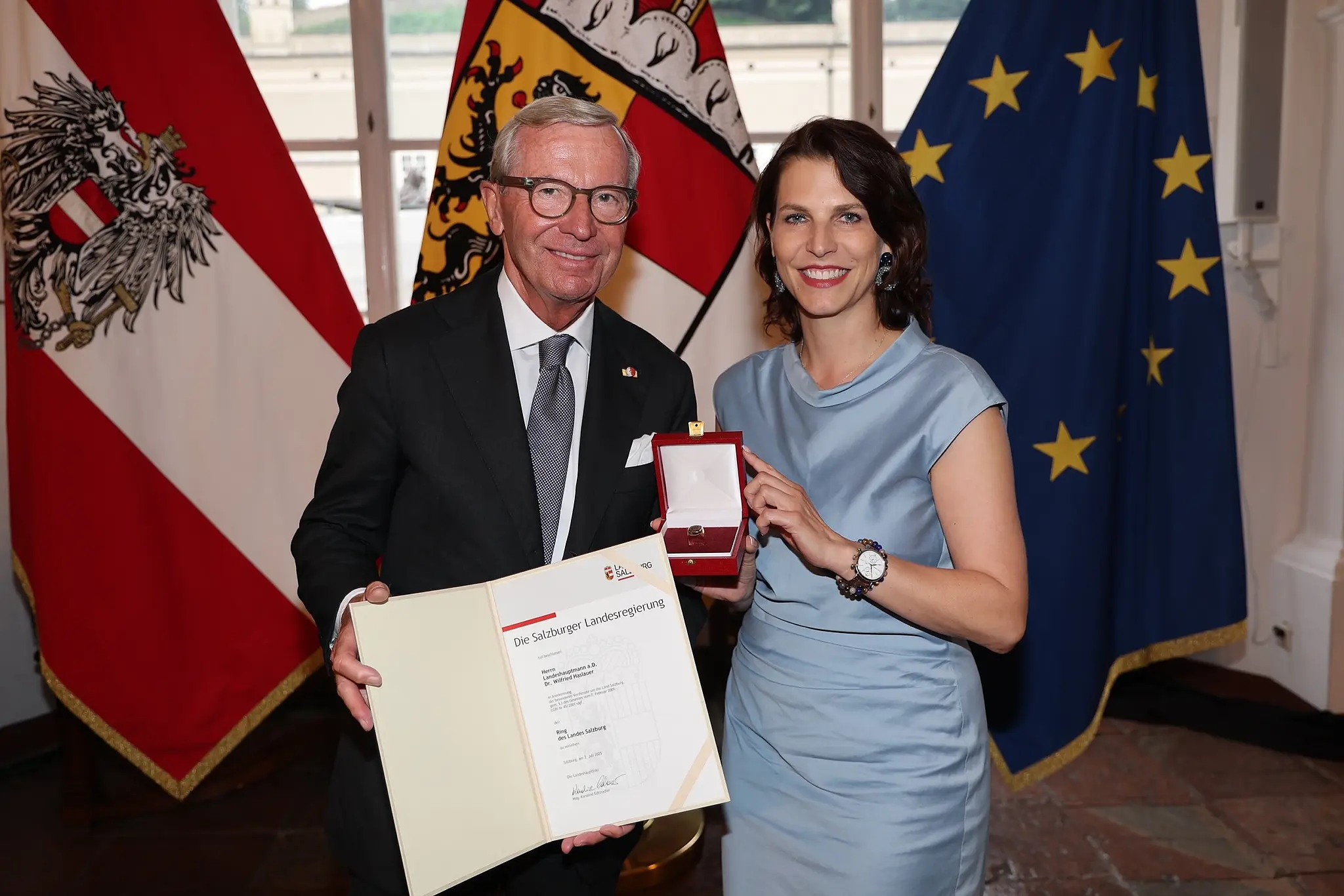 Neu-Landeshauptfrau Karoline Edtstadler (ÖVP) hat ihrem Vorgänger Wilfried Haslauer am Donnerstag bei einem Festakt in der Residenz den Ring des Landes Salzburg überreicht. Diese höchste Auszeichnung des Landes Salzburg wurde zum 75. Mal seit 1956 verliehen.