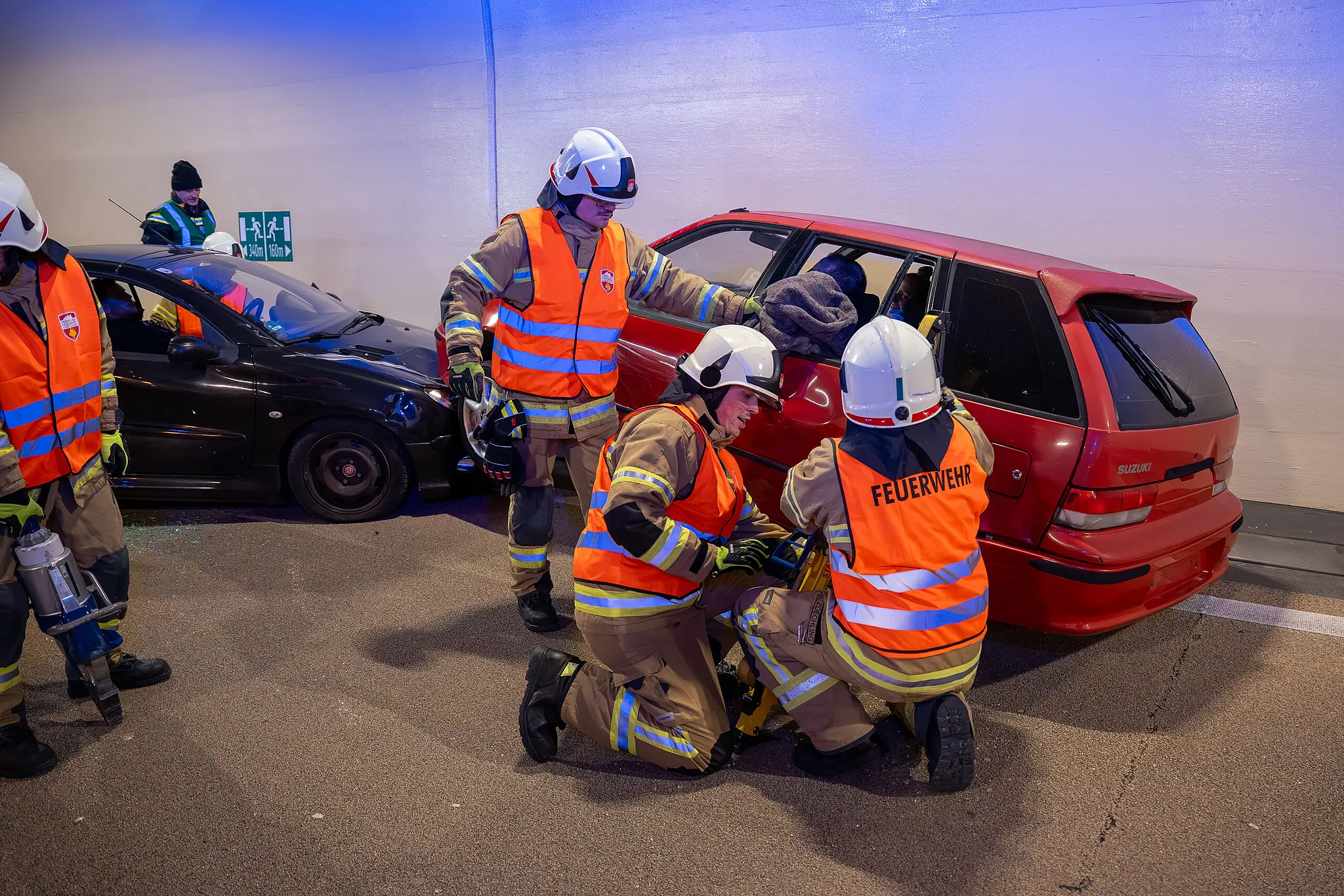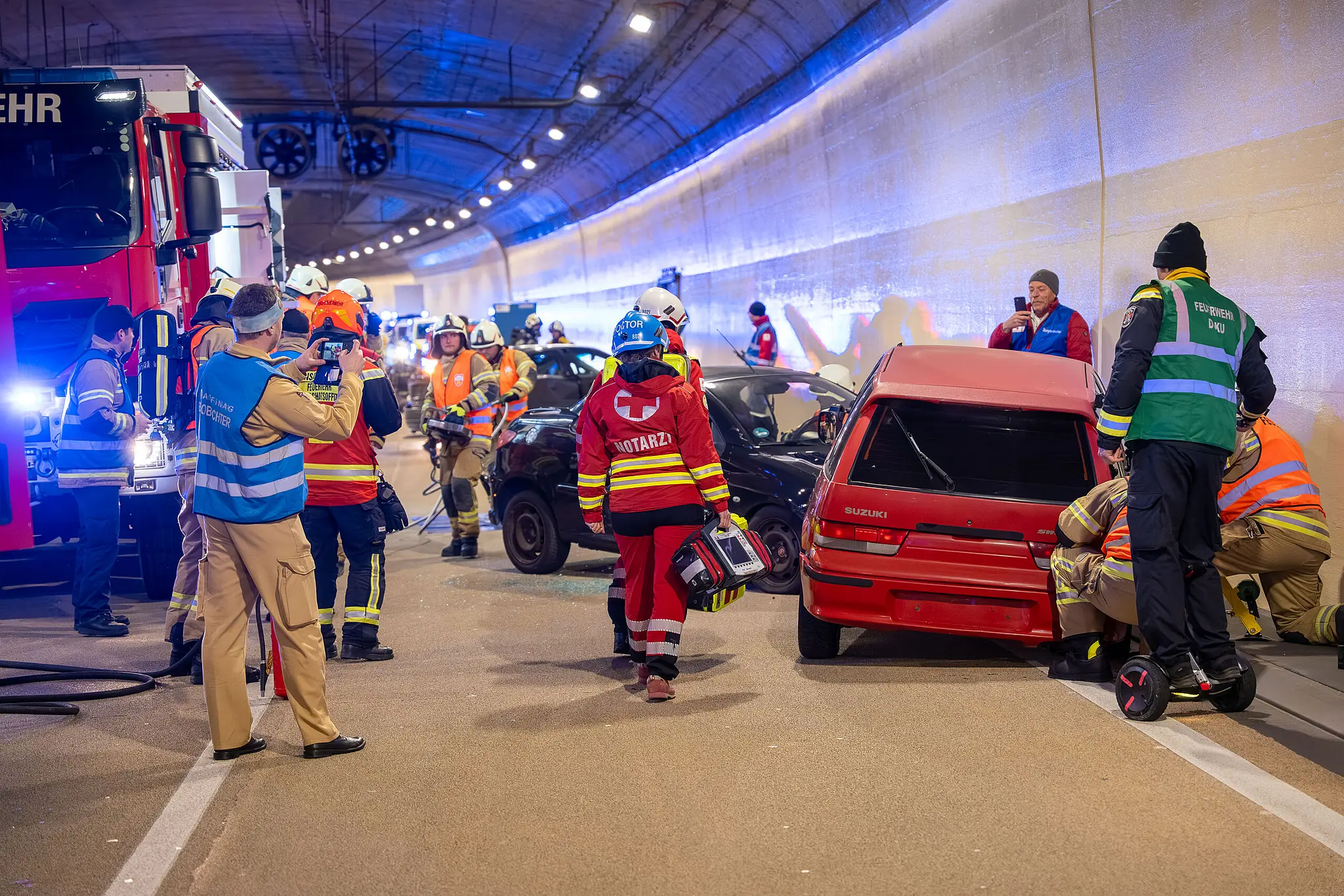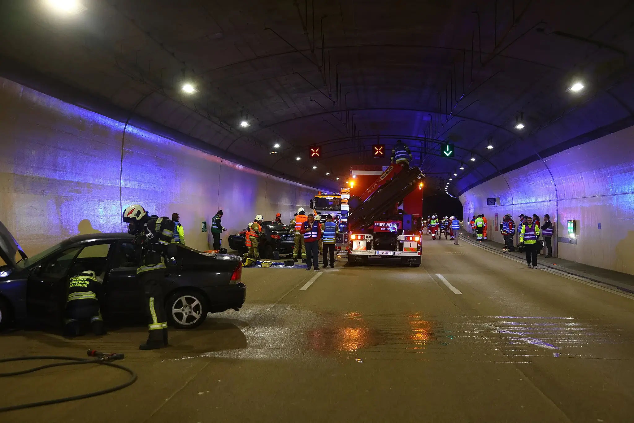 Übungsszenario war ein Fahrzeugbrand, wobei ein Lastwagenfahrer einen Herzinfarkt erlitten hatte und beim Crash drei Autos in Mitleidenschaft zog. Insgesamt vier Verletzte wurden angenommen. Sie wurden von den Feuerwehrkräften mit der Bergeschere gerettet. Im Rahmen der Brandsimulation wurde außerdem im Tunnel auch die Sprühnebelanlage getestet. Insbesondere Menschenrettung, Brandbekämpfung, Kommunikationsabläufe sowie die Alarm- und Einsatzpläne standen dabei im Fokus.