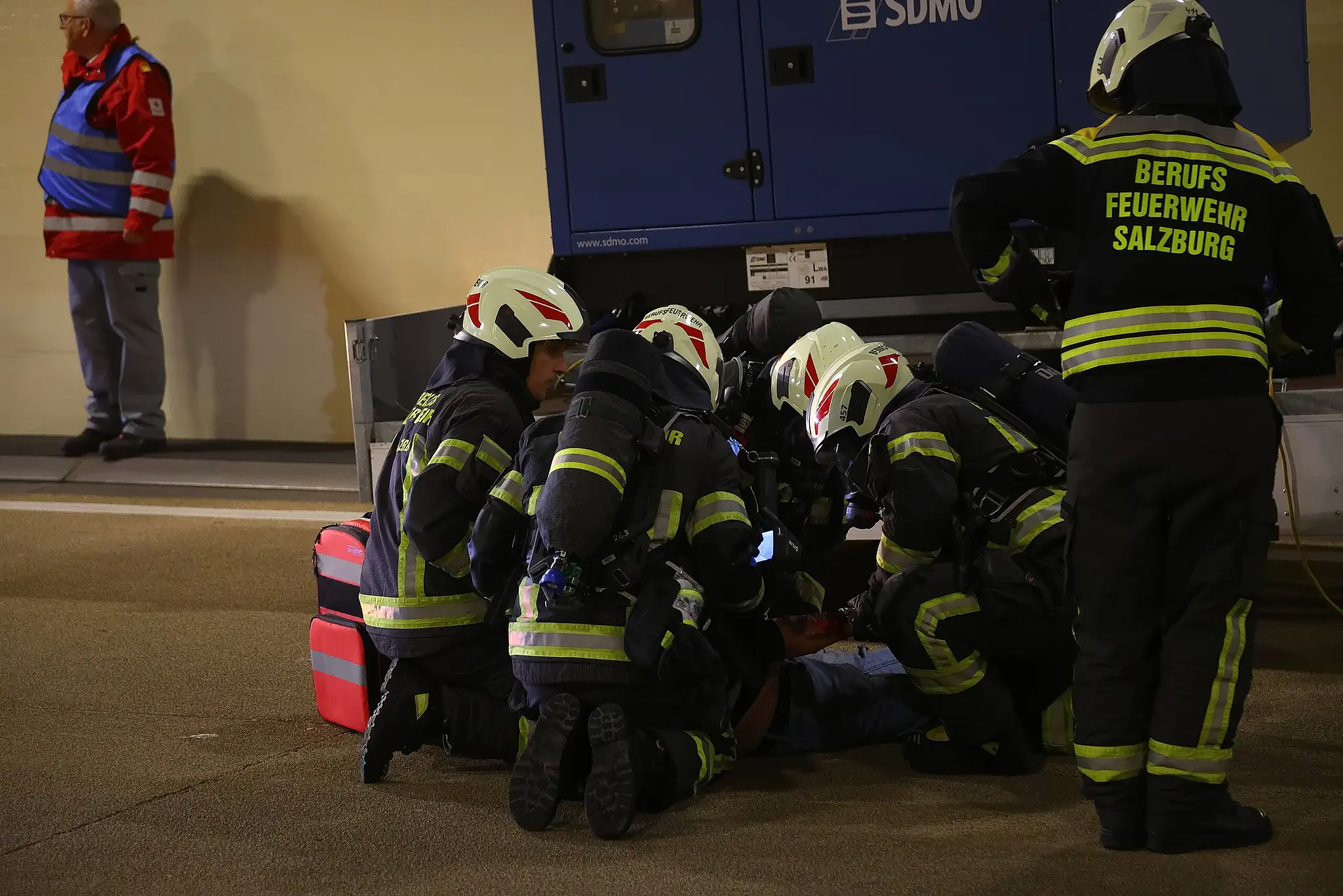 Insgesamt waren an der Übung die Berufsfeuerwehr Salzburg mit vier Fahrzeugen und 16 Mannsowie die Freiwillige Feuerwehr Gnigl mit 12 Mann beteiligt. Das Rote Kreuz war ebenfalls mit 16 Einsatzkräften und sechs Fahrzeugen im Probeeinsatz.