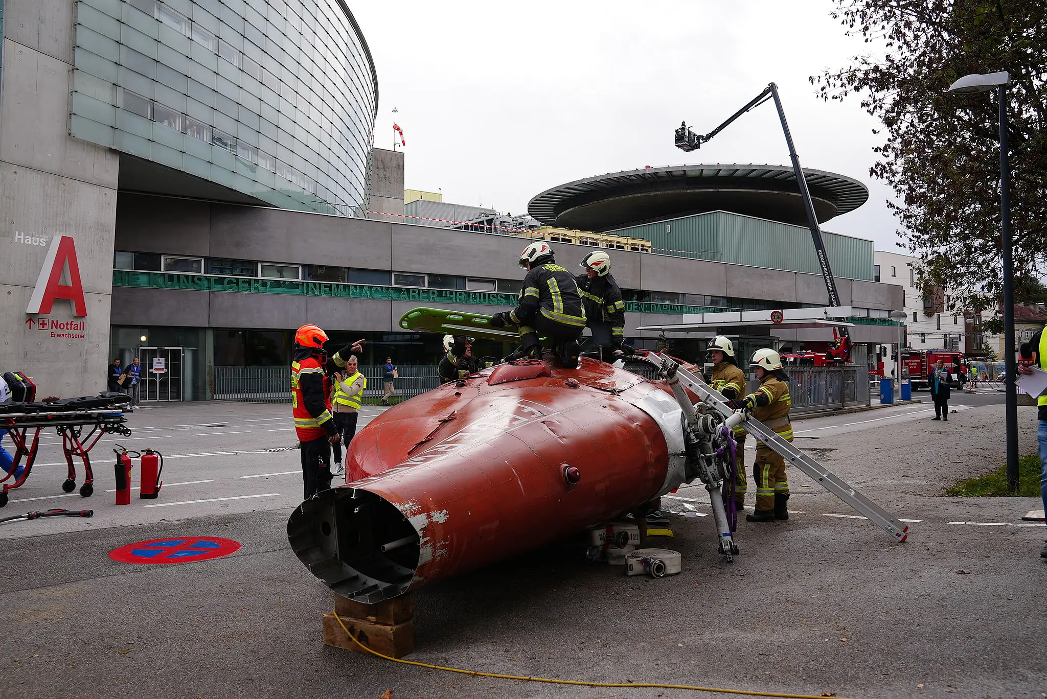 Ein Hubschrauber setzt nach einem technischen Gebrechen hart auf der Heli-Plattform und kracht in Folge auf den Boden. Es gibt 17 Verletzte, sechs davon schwerverletzt – so lautete das Szenario einer Übung, die am Mittwoch im Landeskrankenhaus in der Stadt Salzburg stattfand.
