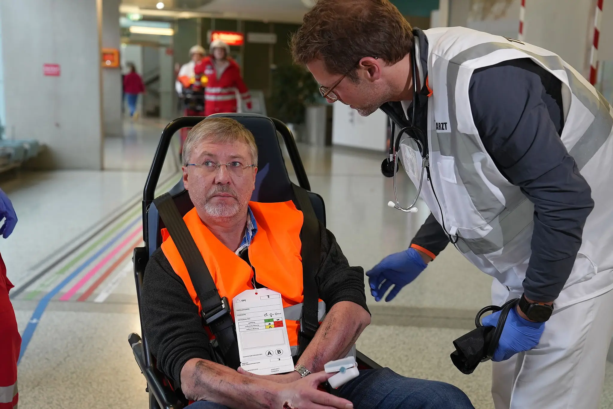 Berufsfeuer und Freiwillige Feuerwehr trafen wenige Minuten nach der Alarmierung am Schauplatz der Übung ein. Die Rettungskräfte des Roten Kreuzes übernahmen die Verletzten und brachten sie zur Triage – also zur Einteilung nach Schwere der Verletzung – in die Chirurgie West. Dr. Wolfgang Fleischmann leitete diese Übungs-Triage: „Es hat gut funktioniert. Jede Übung ist ein Gewinn.“