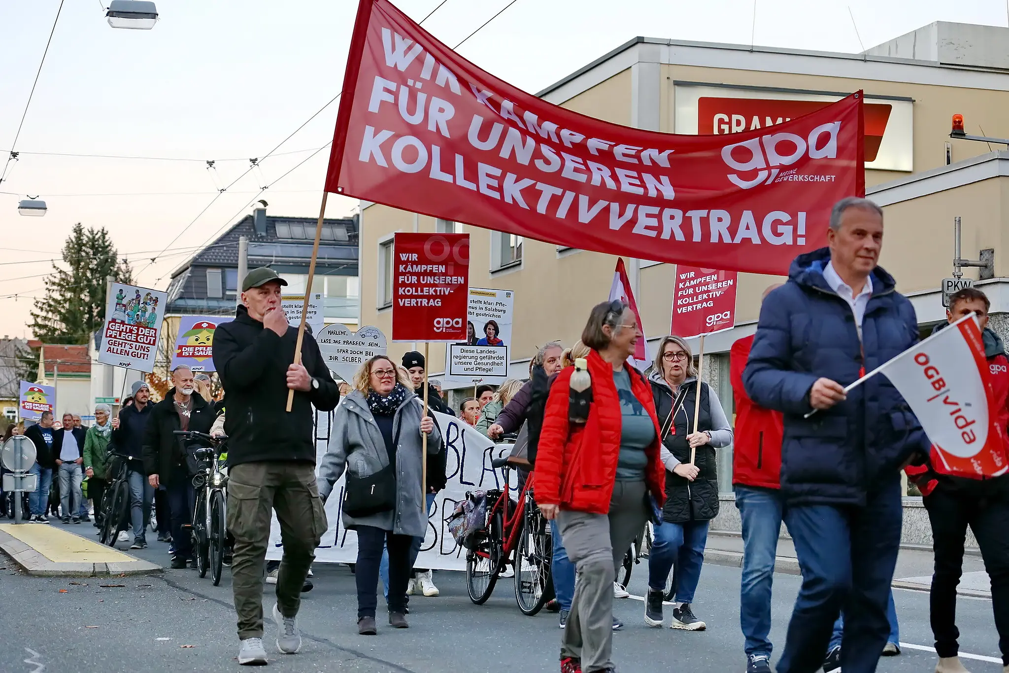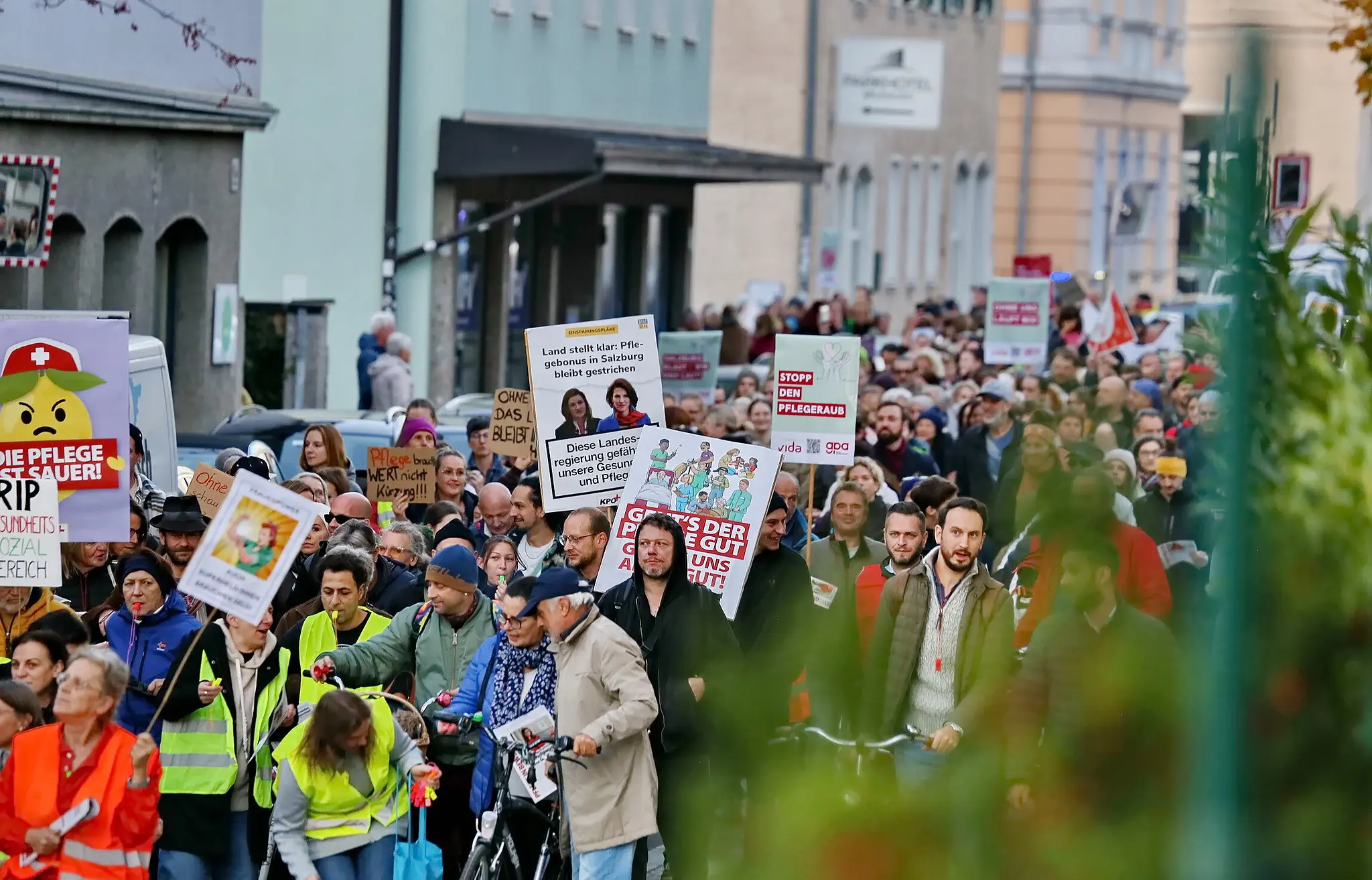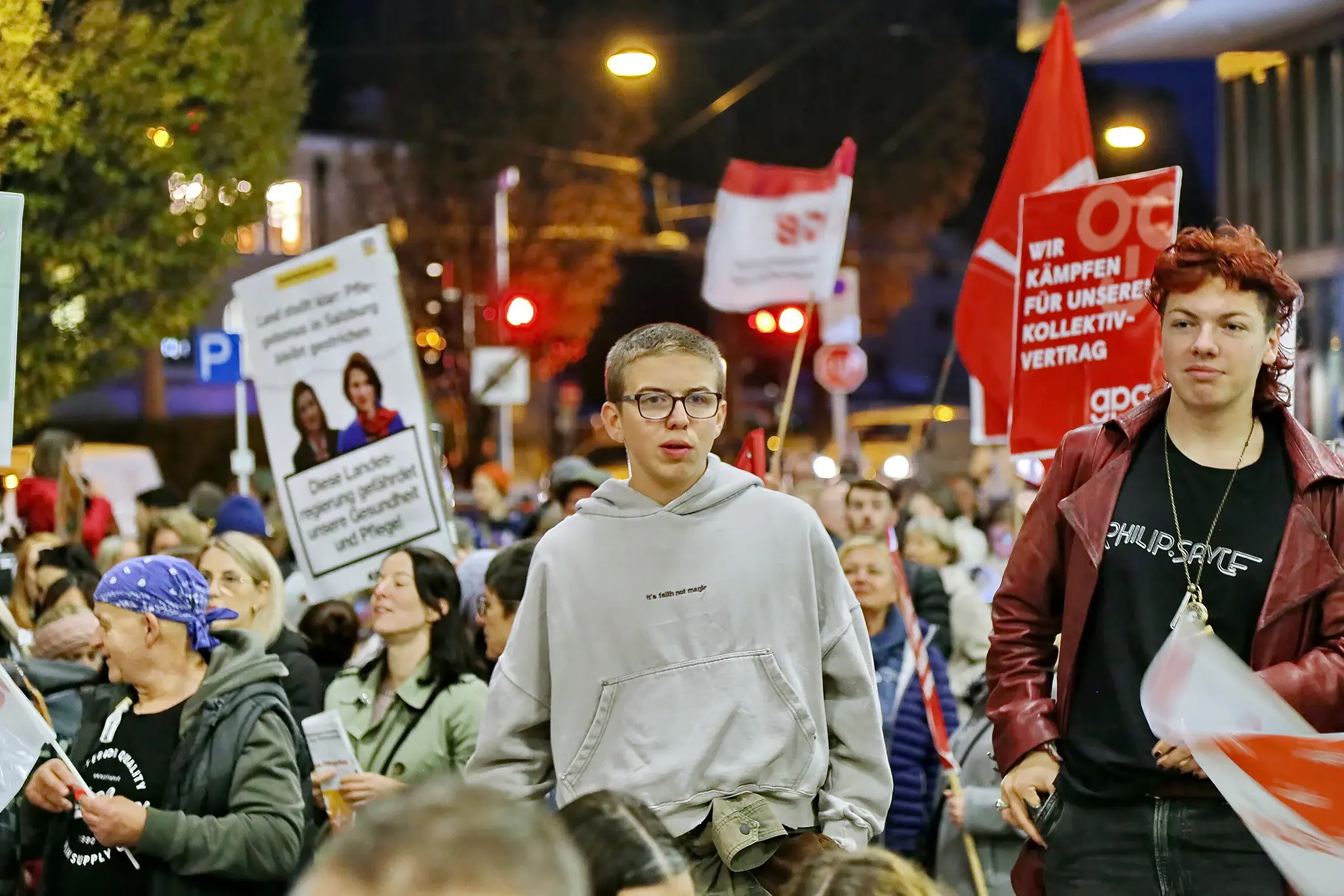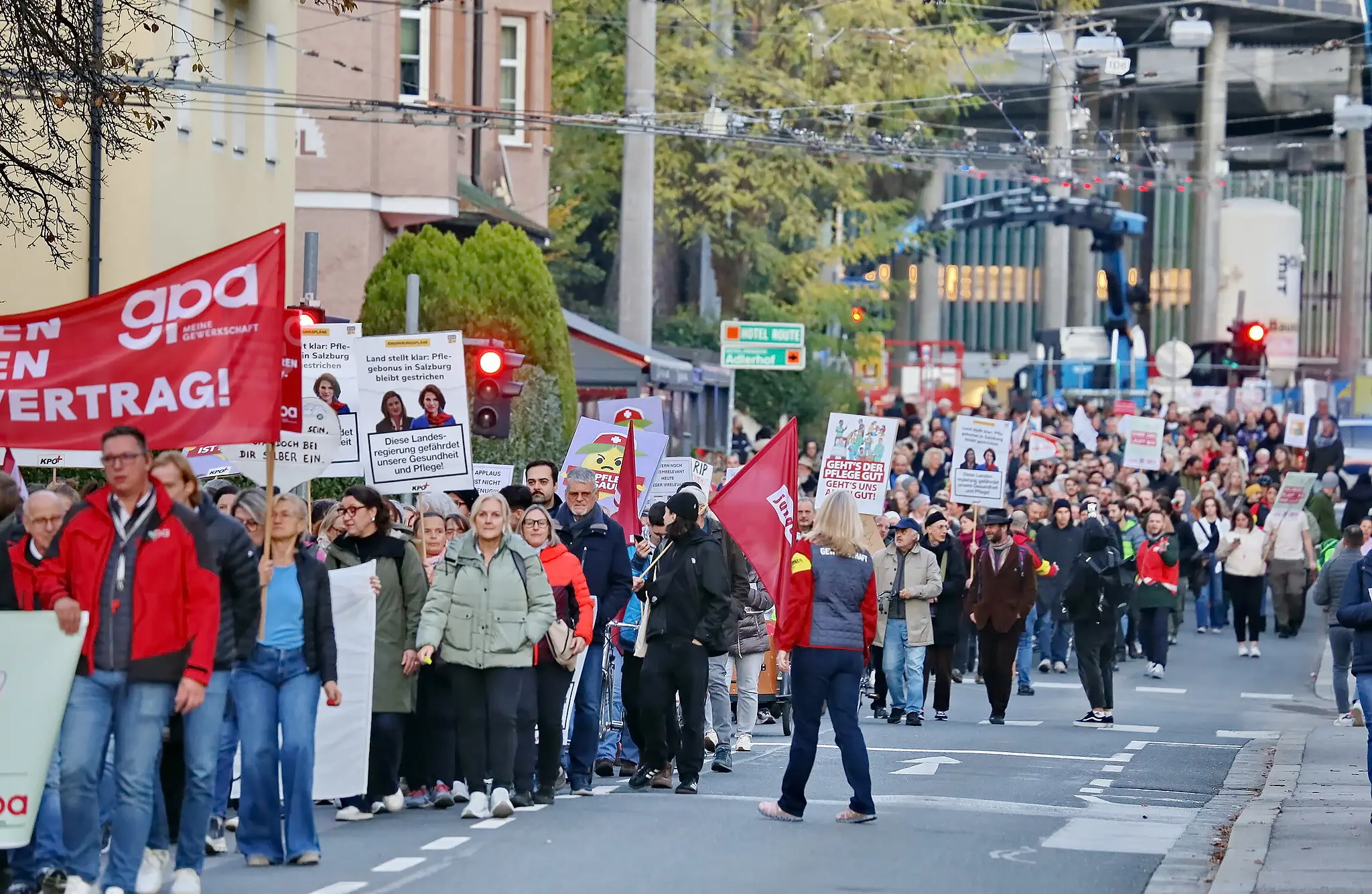 Die Pflegekräfte Salzburgs zeigen sich angesichts der geplanten Einsparungen in ihrem Arbeitsbereich kämpferisch. Am Mittwoch zogen sie gemeinsam mit Angestellten aus den Sozialberufen bei einer Demo durch die Stadt Salzburg. Start war um 16 Uhr beim Parkhotel Brunnauer. Ziel war der Haupteingang der Salzburger Landeskliniken.