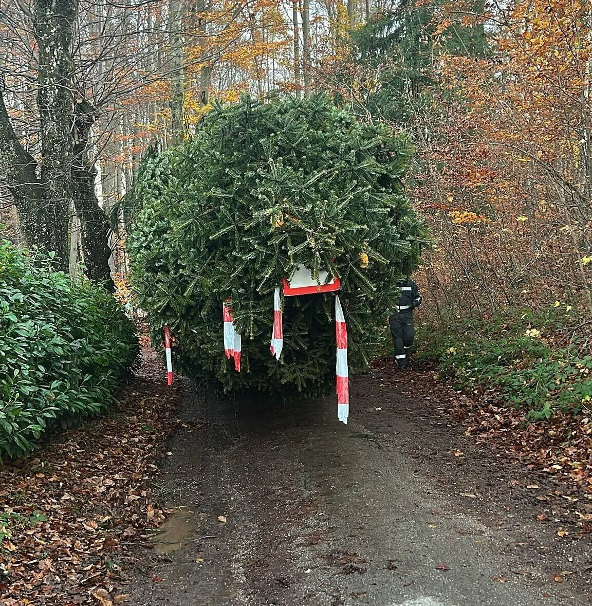 Für die Strecke von knapp zehn Kilometern wurde eine Fahrzeit von rund einer Stunde eingeplant. Der Christbaum wurde um 18 Uhr noch am Residenzplatz in der Stadt Salzburg erwartet. Ursprünglich war von einer Ankunft um 14.30 Uhr – also rund drei Stunden früher – ausgegangen worden. Doch um 18.40 Uhr war die prächtige Tanne weit und breit immer noch nicht zu sehen. Der Grund: Beim Transport kam es zu einer technischen Panne, wie Haider auf S24-Anfrage erklärte. Ein Teil des Nachläufers, auf dem der Baum liegt, sei gebrochen. Das Fahrzeuggespann sei auf Höhe des Vollererhofs in Puch unfreiwillig ausgebremst worden. Wie lange die Reparatur dauern wird, war vorerst unklar.