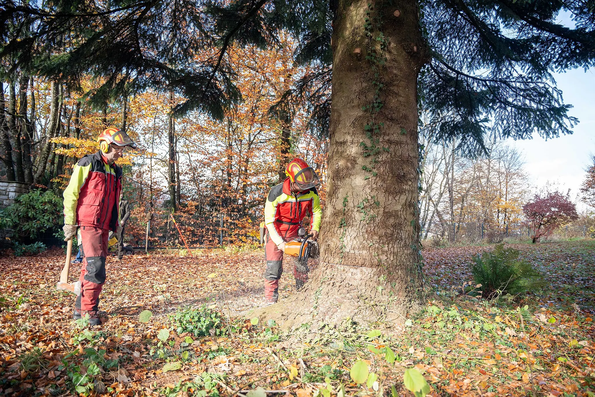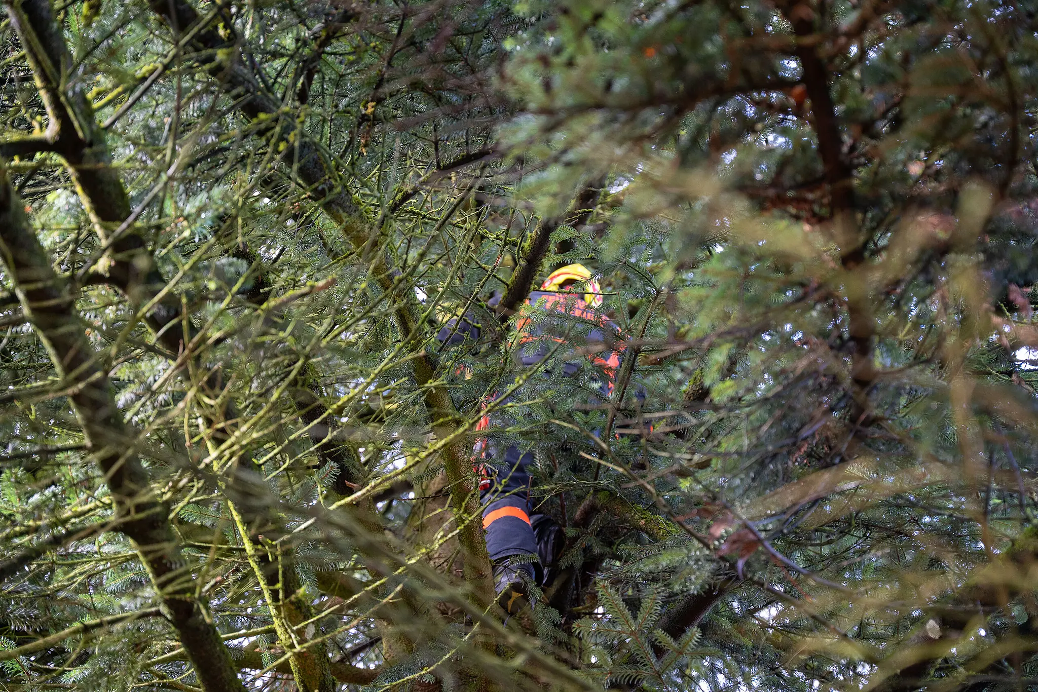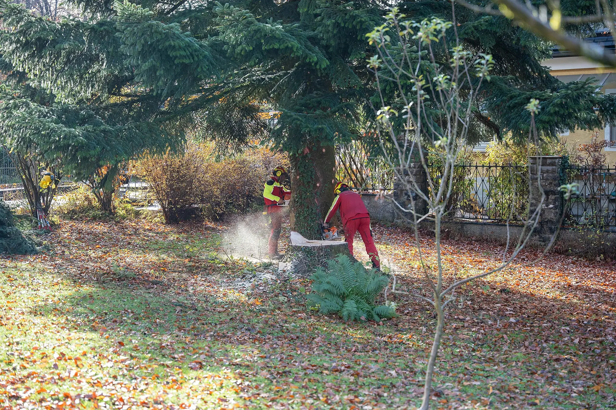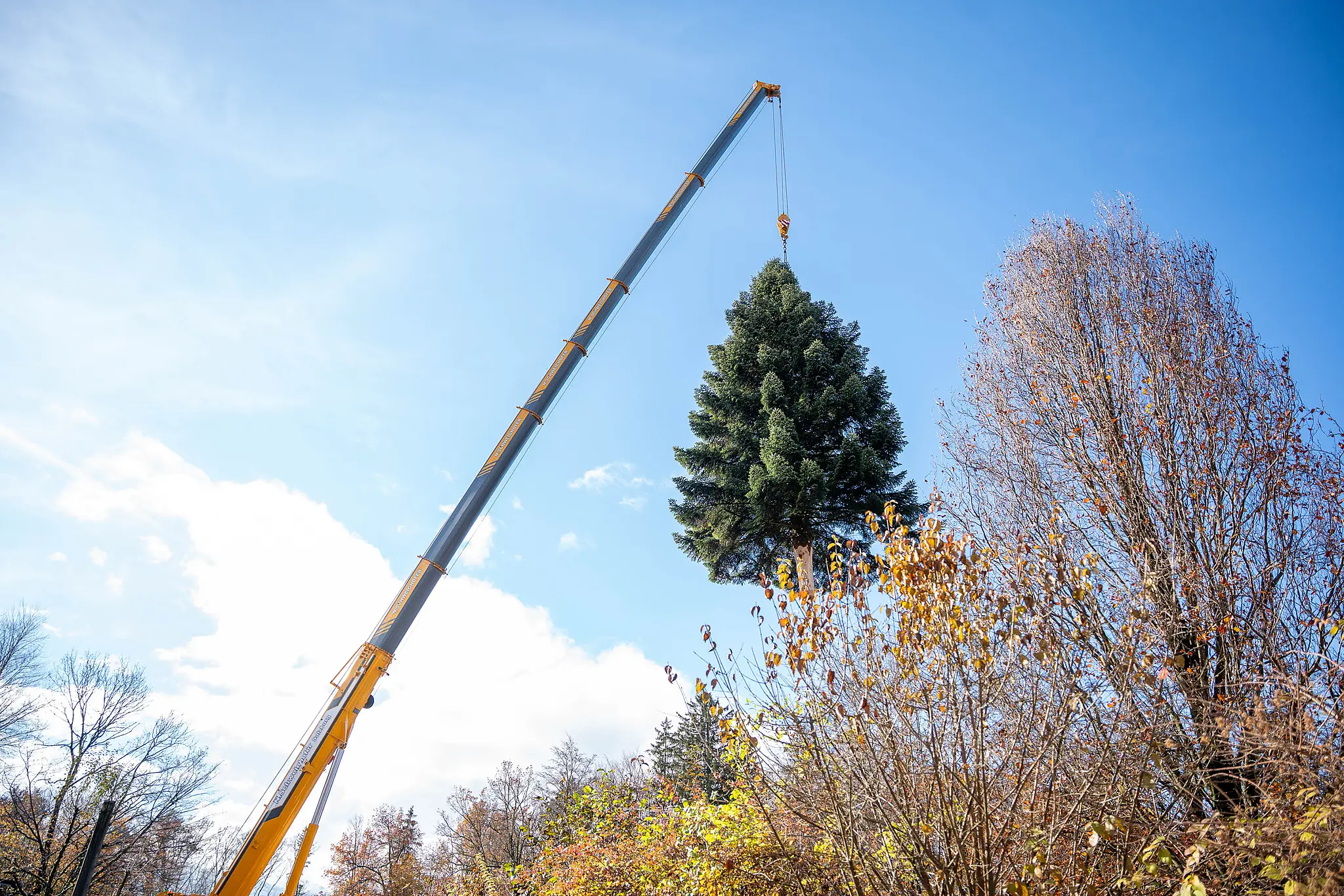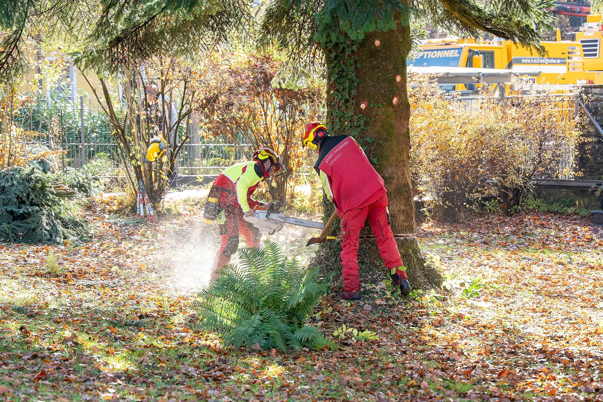 Am Montag trafen Berufsfeuerwehr, Gartenamt der Stadt Salzburg und eine Firma mit einem Spezialkran vor Ort zur Ernte ein. Vorgesehen war ein straffer Zeitplan: Um 9 Uhr sollte mit den Baumfällarbeiten begonnen werden, schon eine halbe Stunde später sollte der Christbaum auf den Transporter verladen werden.