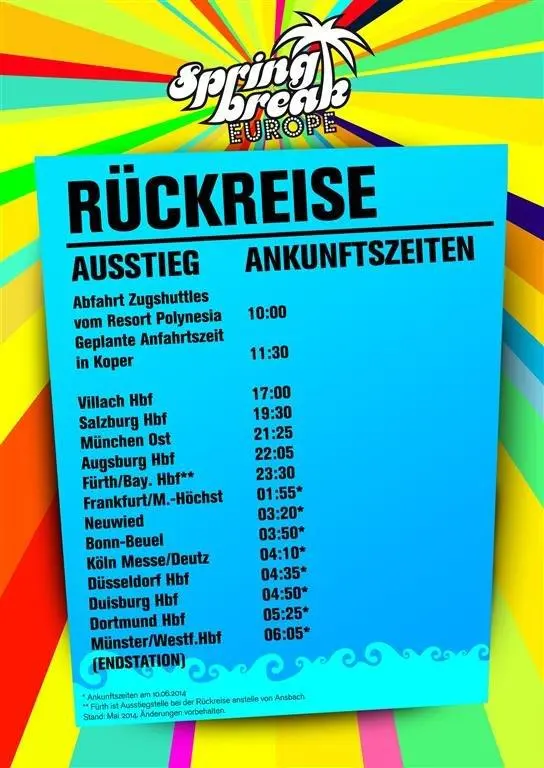 Der Veranstalter Splashline bietet den Gästen nahezu eine rundum Betreuung während des Springbreak Europe. Ein Service, mit dem sich der Springbreak Europe nicht nur wegen seines Entertainmentprogramms von den mittlerweile vielen „Nachahmern" abgrenzen kann. Ungefähr 200 sogenannte „Mates" betreuen die Gäste schon während der Anreise im Zug und vor Ort. Auf der Veranstaltung selbst sorgen etwa 120 Securities, 20 Sanitäter und 2 Ärzte für die Sicherheit und das Wohlergehen der Besucher.