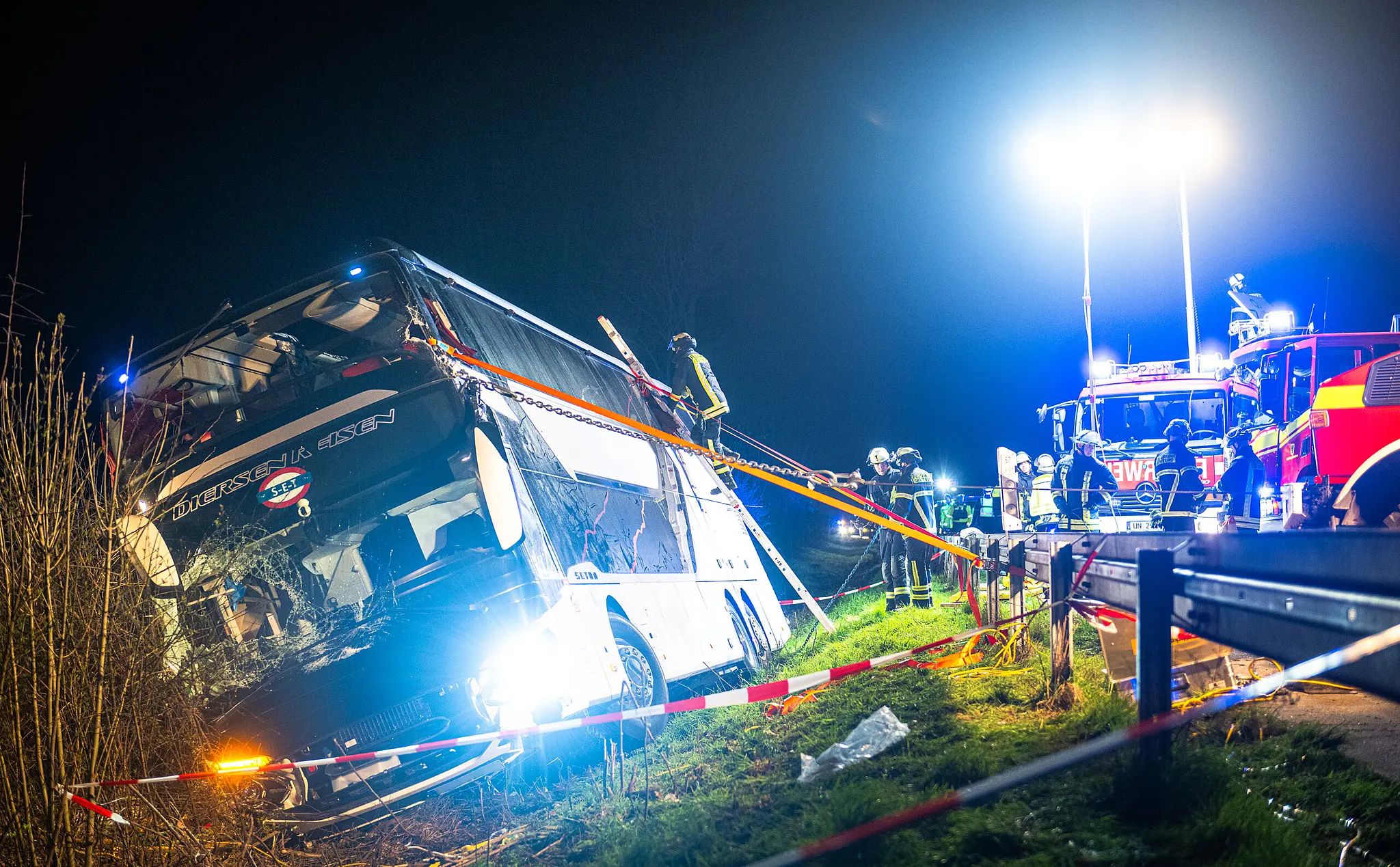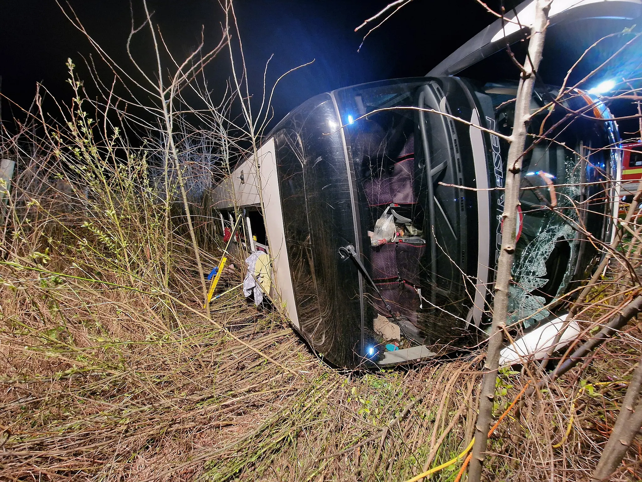 Ihr doppelstöckiger Reisebus kam bei Werl von der Autobahn ab, fuhr in den Straßengraben und stürzte auf die Seite. Nach Polizeiangaben wurden 21 der 60 Insass:innen verletzt, eine Person erlitt schwere Verletzungen. In Lebensgefahr sei niemand, hieß es. Rettungswagen brachten die Verletzten in umliegende Krankenhäuser. Auch der Busfahrer wurde medizinisch versorgt. Äußerlich wurde der Fahrer den Angaben zufolge durch den Unfall nicht verletzt, obwohl die Windschutzscheibe des Busses zerstört worden war. Hinweise auf Alkoholkonsum oder Drogen gebe es nicht, sagte ein Polizeisprecher. Es werde in alle Richtungen ermittelt.