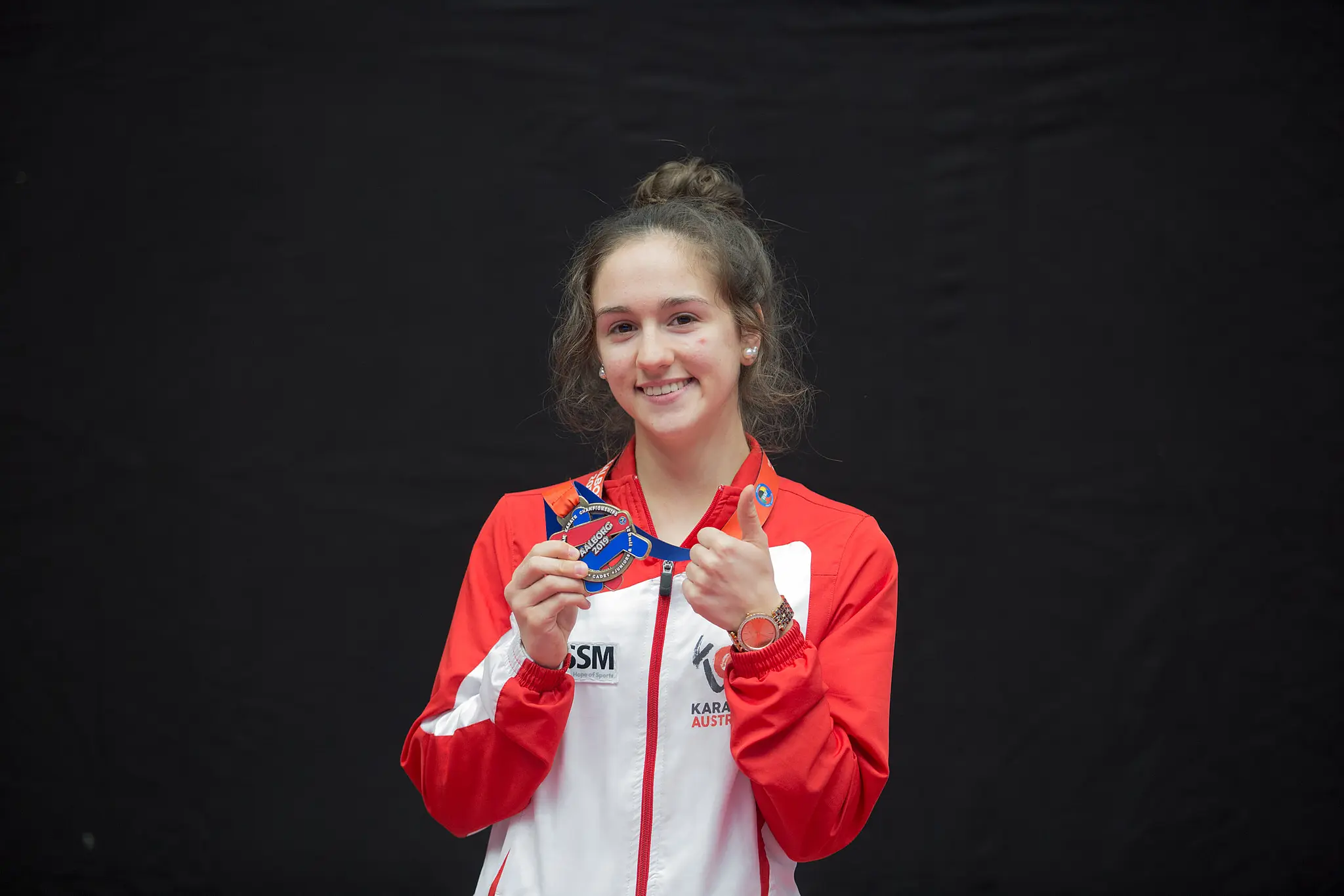 Wenig später verdoppelte sich der Karate-Austria-Jubel: Die Vorarlbergerin Hanna Devigili gewann nach U16-Gold nun U18-Bronze in der Klasse bis 59 Kilo.